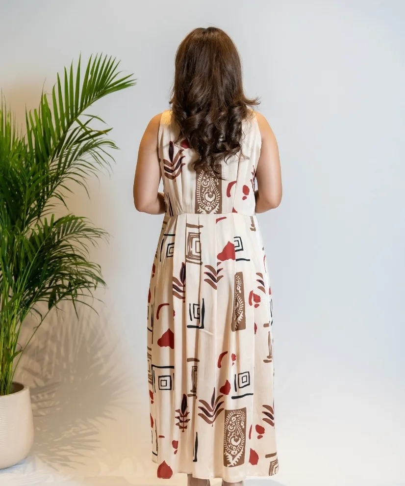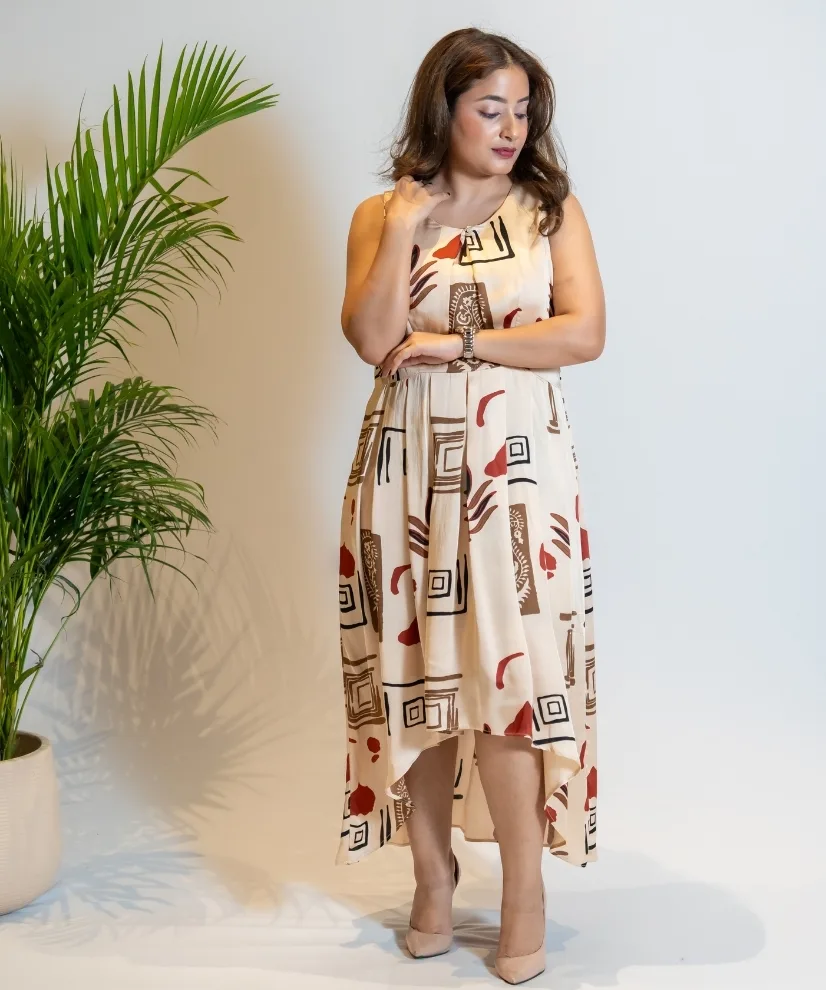 Artful and airy, this 1-piece cotton-linen dress in almond beige features striking multicolour abstract motifs and soft pleating at the bust. The flared silhouette and high-low hem add a touch of movement and drama — perfect for sunny days, gallery visits, or coffee catch-ups with a twist of style..