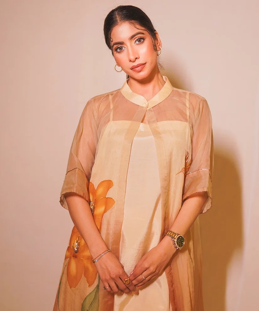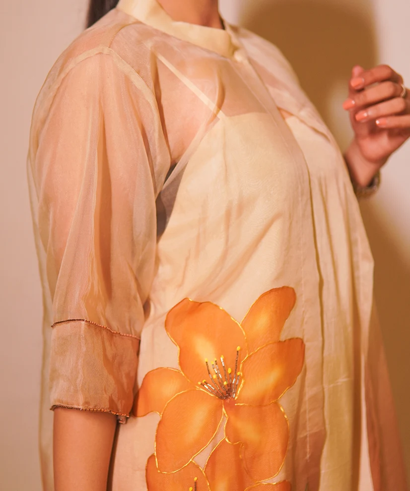 This elegant kurta set features a sheer organza shrug in a warm apricot-beige tone, layered over a cotton silk kurta and pants. Adorned with hand-painted floral motifs on one panel and a delicate kingfisher bird on the other, it beautifully blends artisanal craftsmanship with contemporary elegance. Light, graceful, and effortlessly stylish, this ensemble is ideal for light festive occasions and intimate day or evening gatherings.