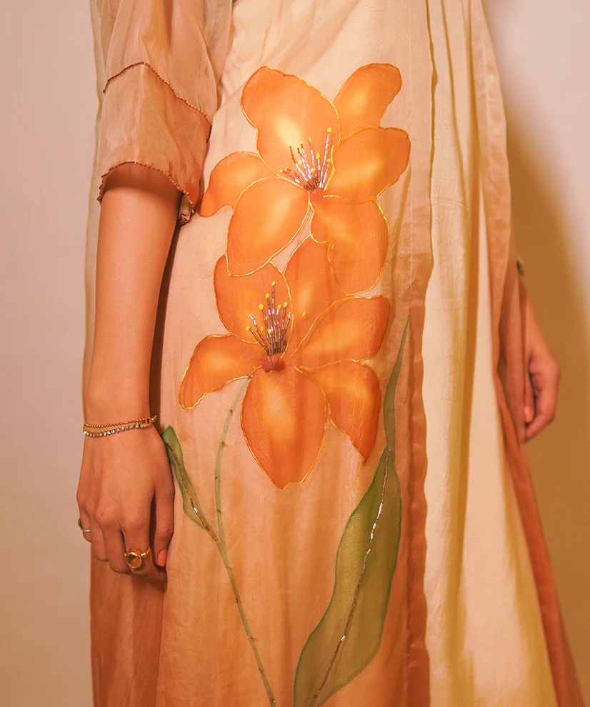 Fabric: Organza Shrug with Cotton Silk Inner & Pants | Hand-painting on the Shrug | Color: Apricot & Biege Shaded | 3 piece set Kurta, Pant & Shrug Set