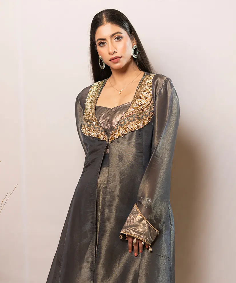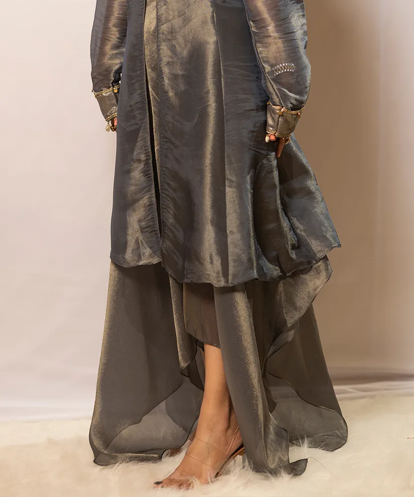 Fabric: Tissue Kurta Set with Skirt | Color: Charcol Grey | 3 Piece Set : Tissue Hand-embellished Kurta with Skirt and Bustier