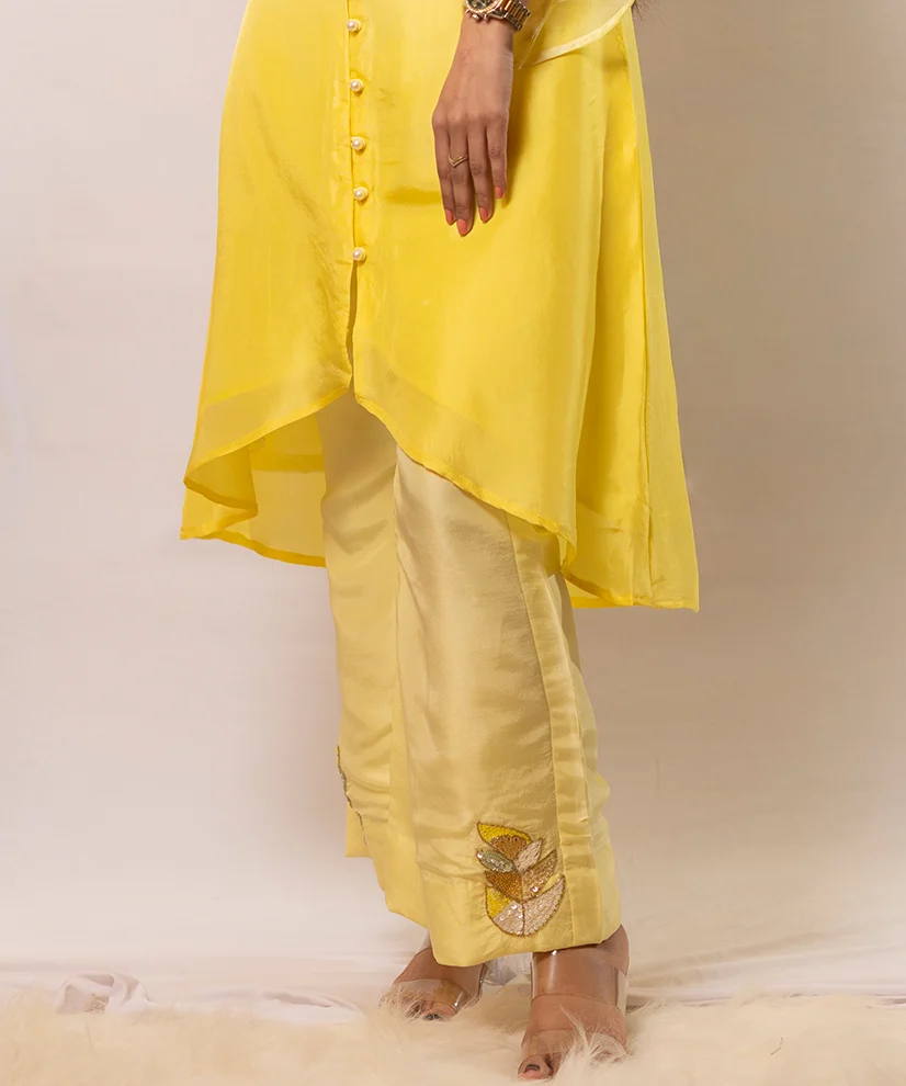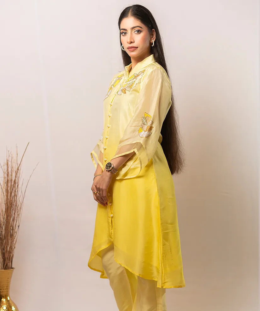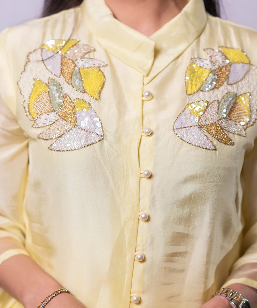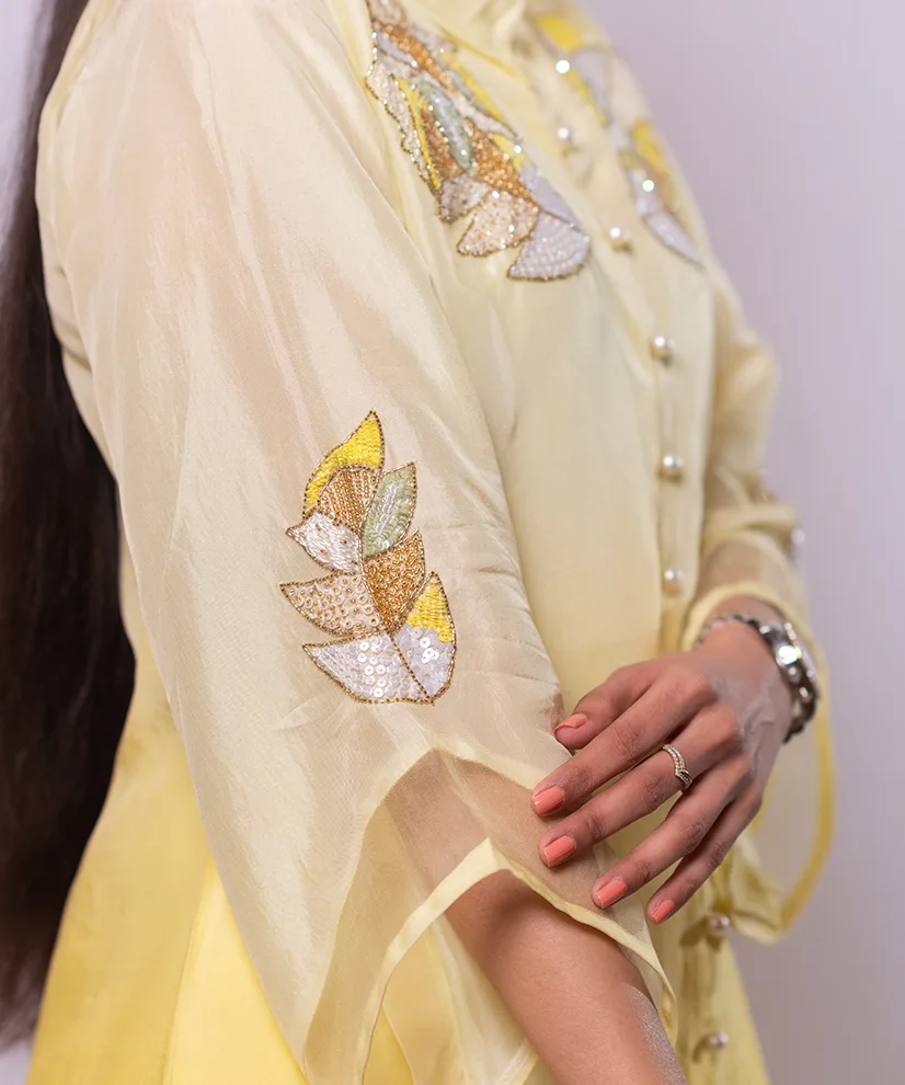 Crafted in luxurious Upada silk, this co-ord set features a radiant butter-yellow to marigold ombré that glows beautifully on the skin. The kurta, pants, and sleeves are adorned with intricate Aari Zardosi floral motifs, delicately highlighted with pearl detailing along the button placket. Light, elegant, and effortlessly festive, this ensemble is designed to move seamlessly from daytime celebrations to intimate evening gatherings.