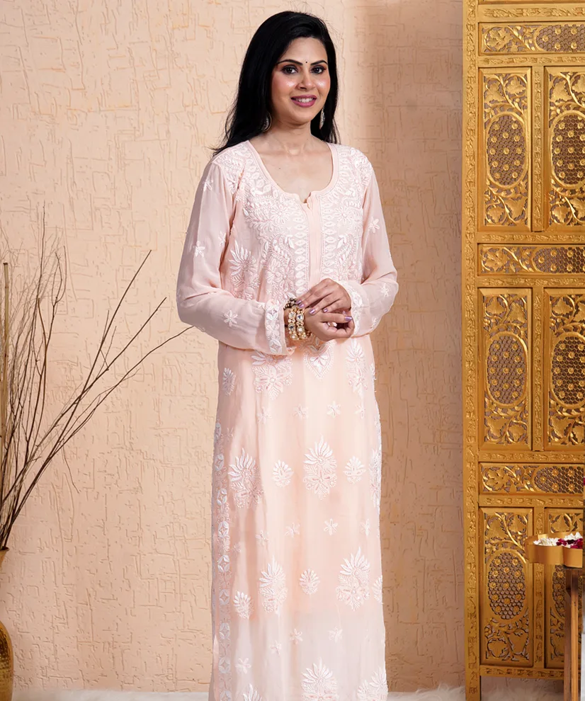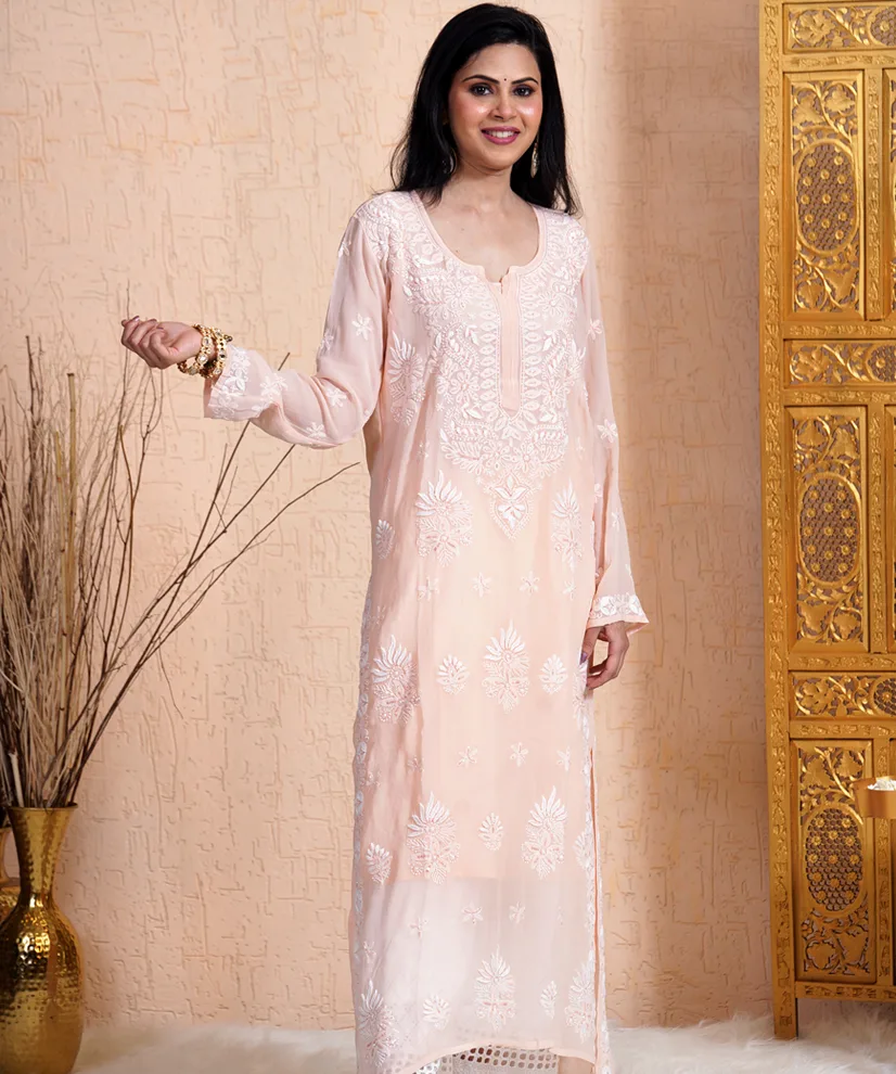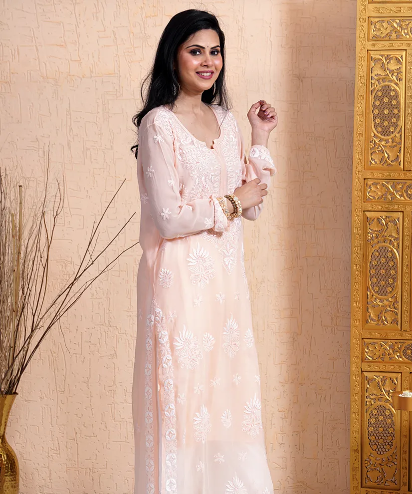 An exquisite blend of Lucknowi craftsmanship and contemporary elegance, this Blush Peach Georgette Kurti is adorned with delicate hand-embroidered Chikankari and sparkling Katdana embellishments. The floral threadwork around the neckline enhances its timeless charm, making it a wardrobe essential for women who appreciate effortless grace