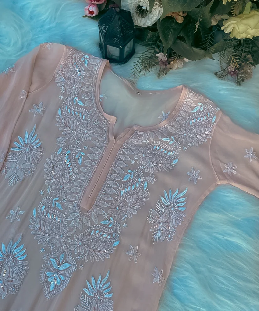 Fabric: Georgette | Weave: Lucknowi Chikankari Hand Embroidery with Katdana Work | Color: Blush Peach |Only the Kurti is included