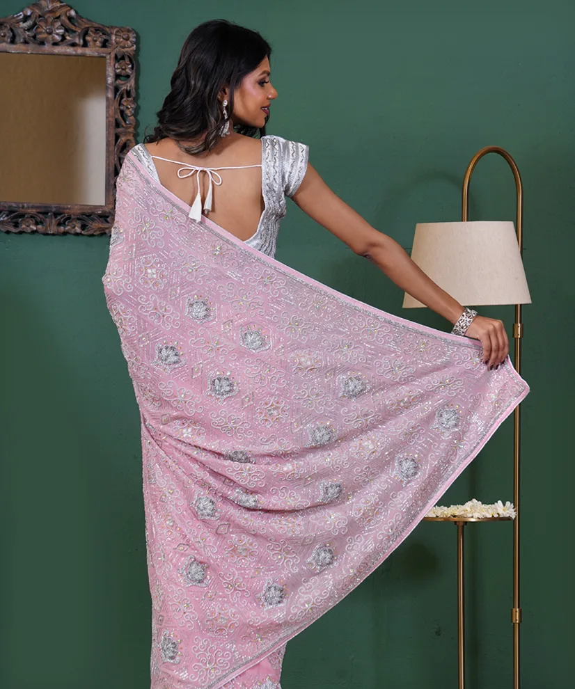 Fabric: Pure Georgette | Weave: Heavy Katdana & Mukesh Handwork | Color: Blush Pink | Blouse: Matching Unstitched