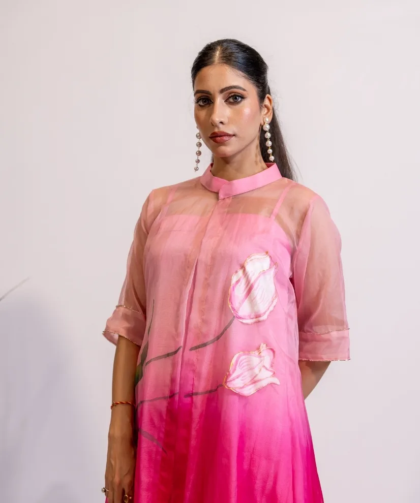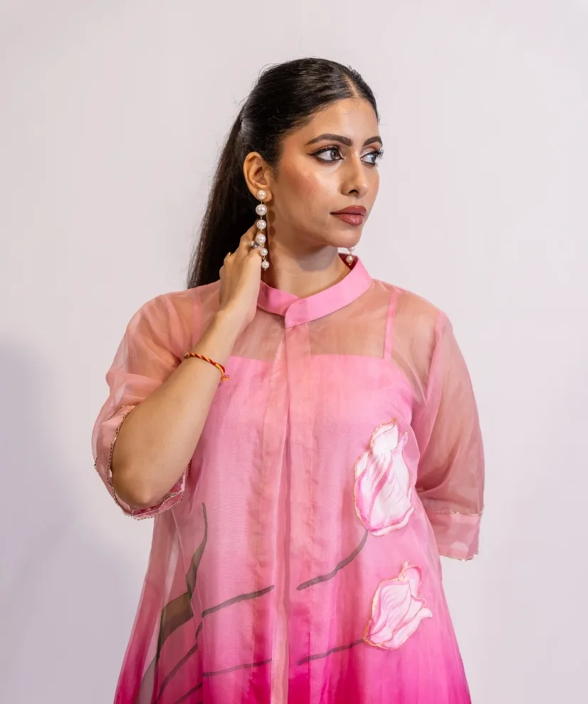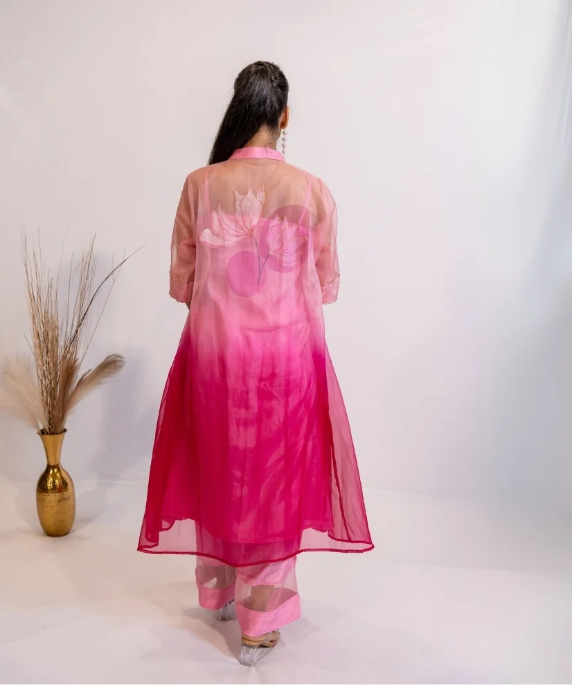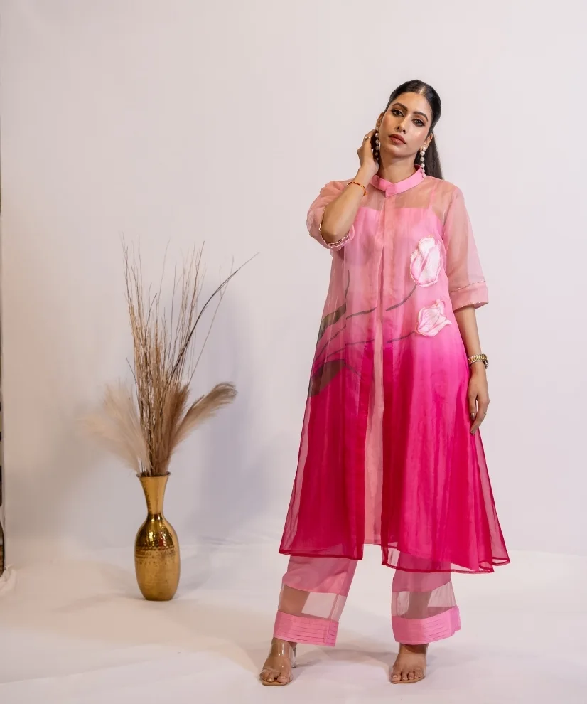 Step into elegance with this stunning ombre shaded Fuschia Pink Organza Handpainted kurta set. The Organza shrug is a canvas of artistry with hand painted floral motifs in soft pink & white hues. The set comes with matching inner kurta & pants made from soft breathable cotton silk fabric.