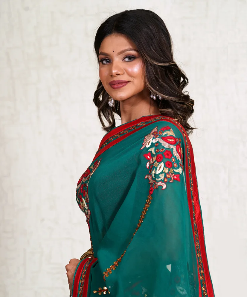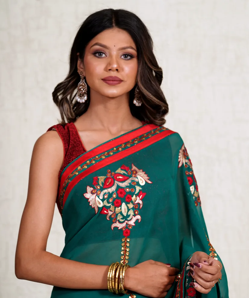 Fabric: Pure Georgette | Weave: Aari Zardozi | Color: Bottle Green | Blouse: None