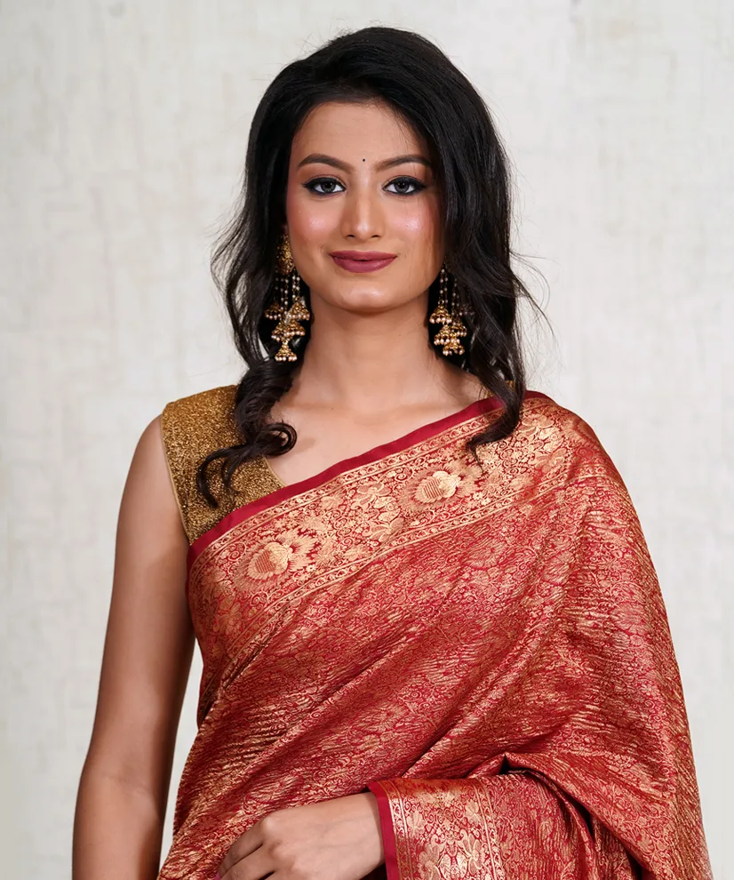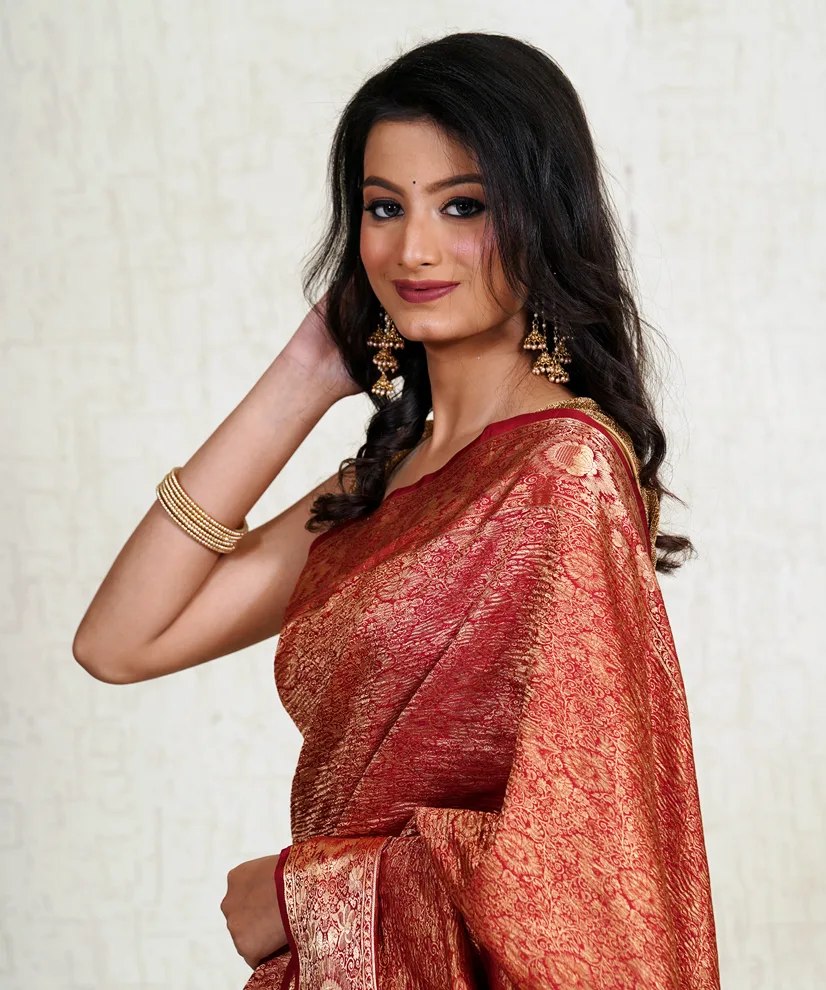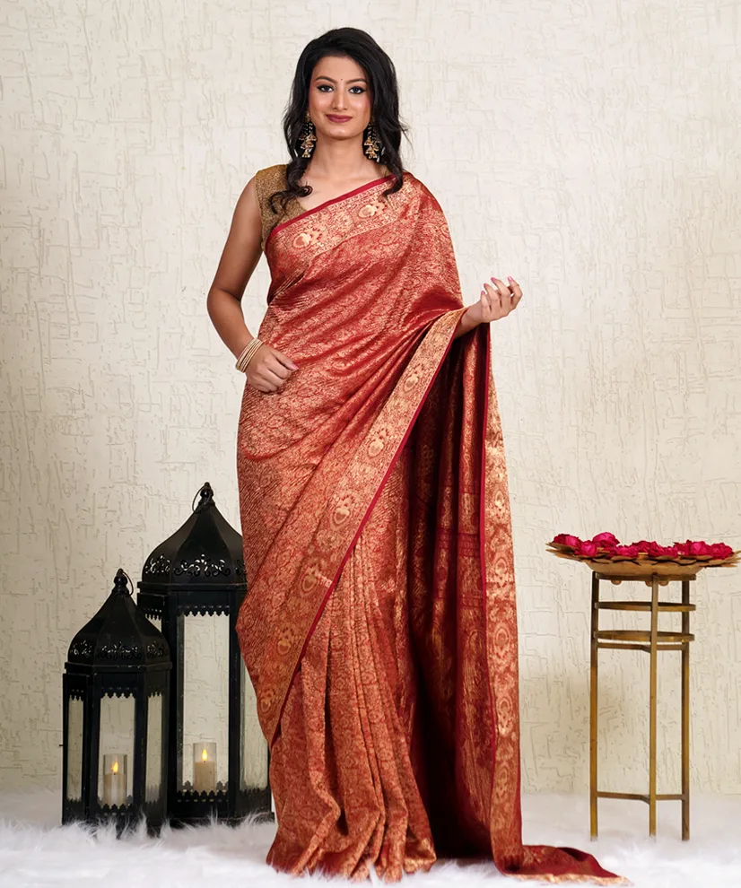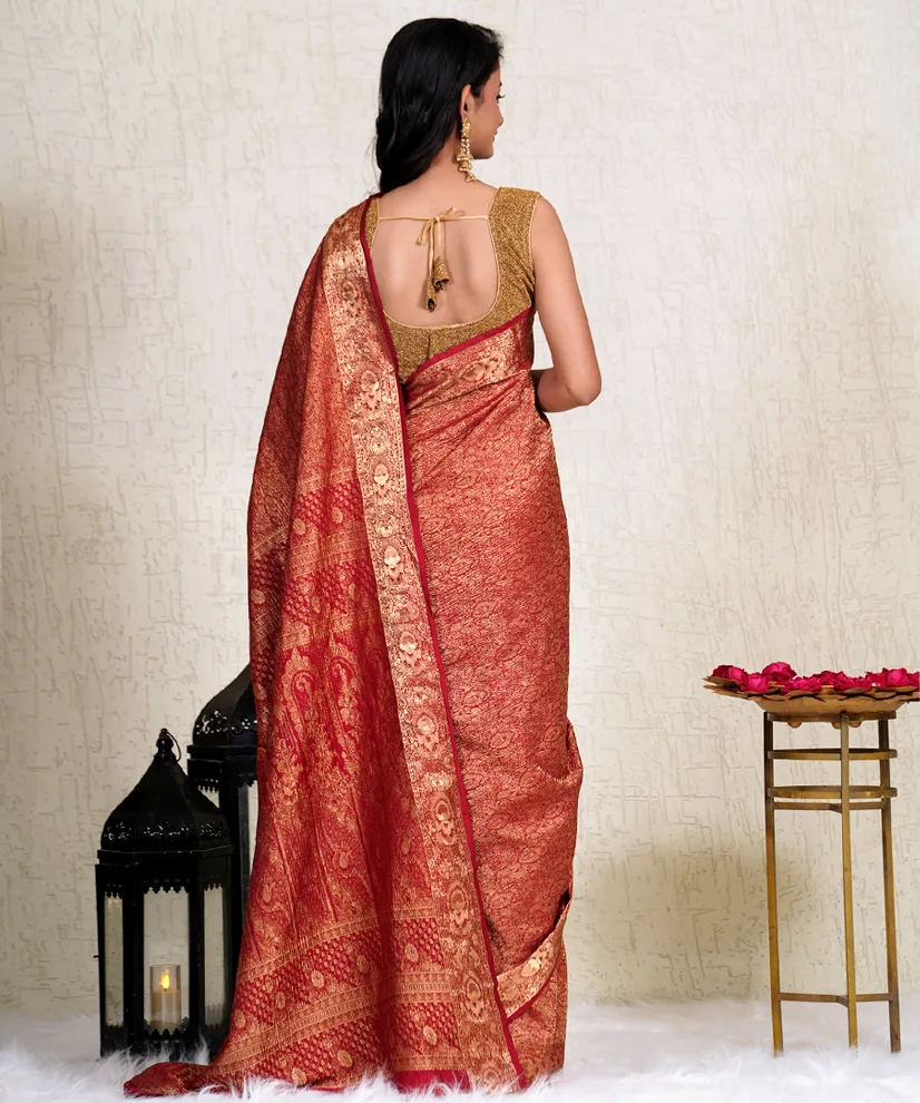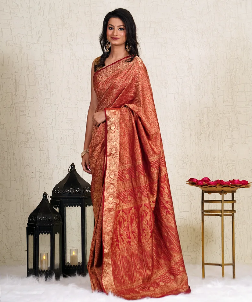 Drape yourself in sheer opulence with this Burnished Gold Crushed Silk Banarasi Saree, an embodiment of grandeur and grace. Handwoven in Banaras, this saree features an exquisite brocade weave with intricate motifs that shimmer elegantly, making it perfect for wedding receptions and festive occasions. The crushed silk texture adds a distinctive regal appeal, while the luxurious burnt gold and deep red hues exude warmth and richness. The saree comes with a matching unstitched silk blouse, offering versatile styling options.