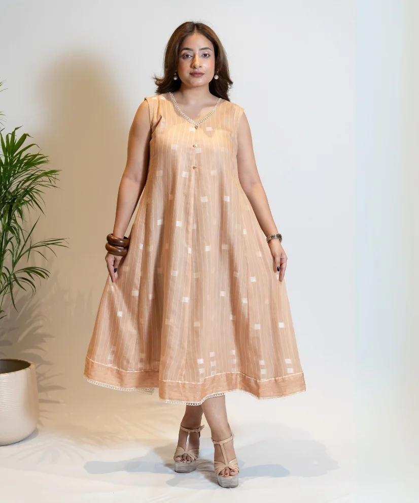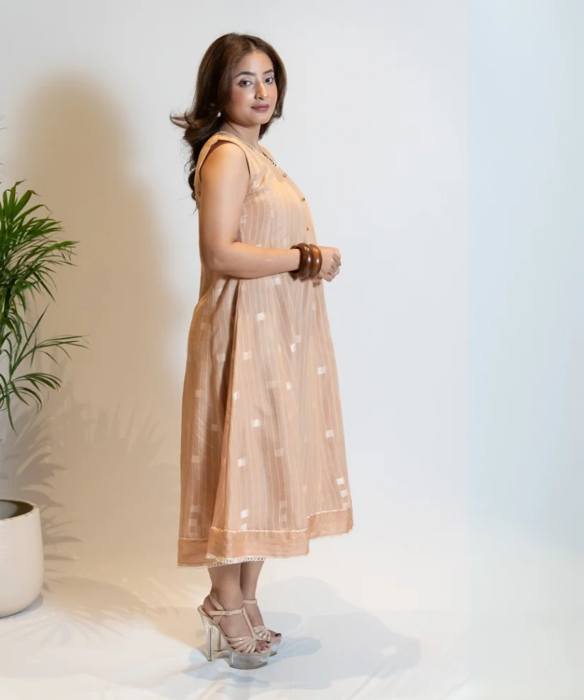 Crafted from pure Eri silk, this caramel beige summer dress brings together heritage weaving and effortless femininity. The flowy A-line cut, delicate button-down detail, and breezy sleeveless silhouette make it a go-to for warm days. Light, breathable, and beautifully minimal — this is slow fashion at its most graceful.