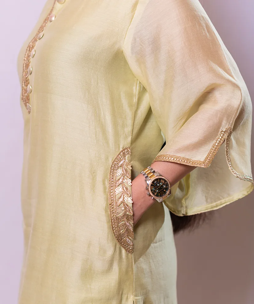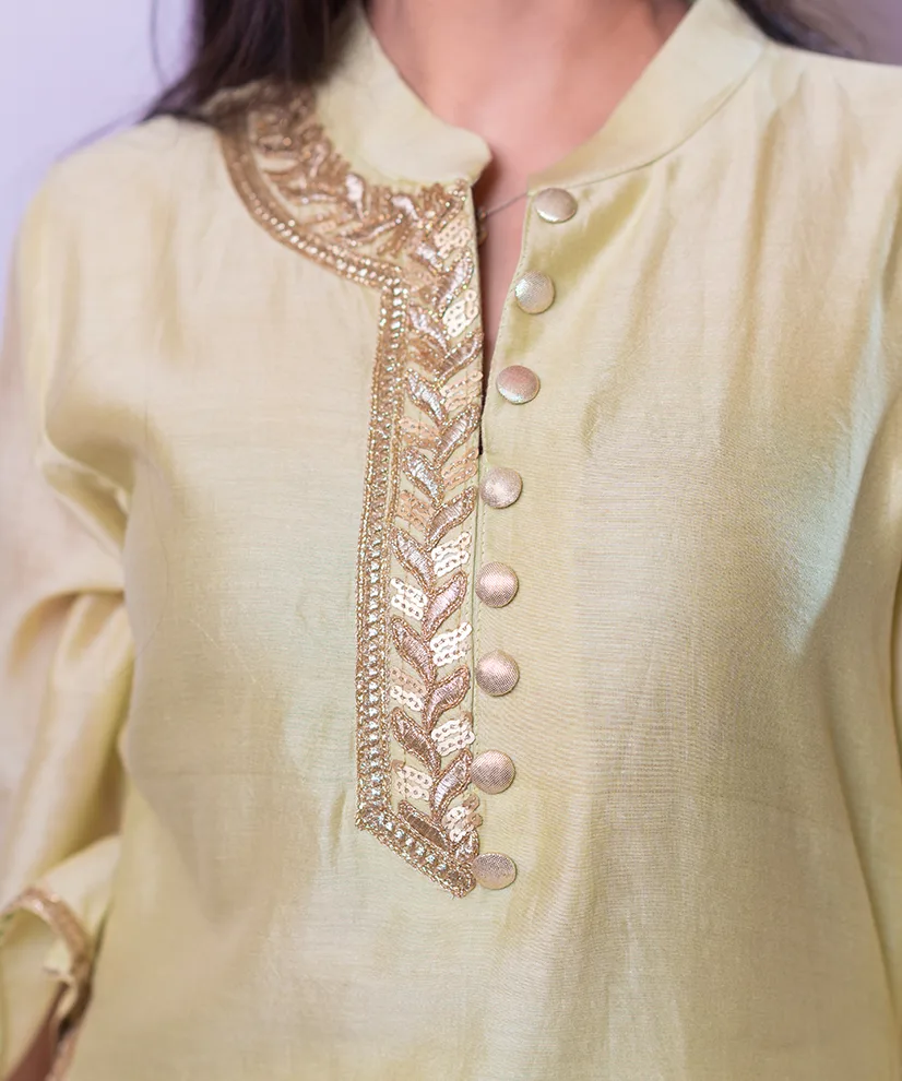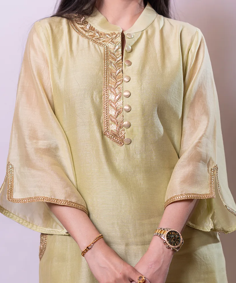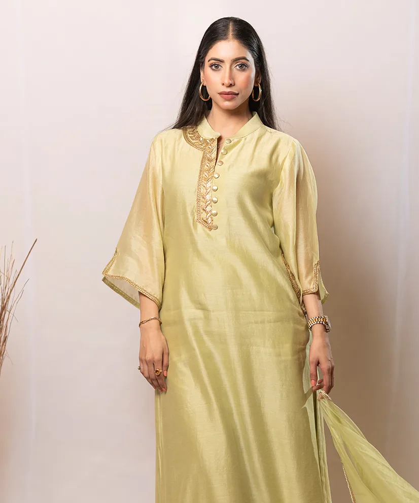 Crafted in airy Chanderi silk, this three-piece kurta set features delicate katdana floral lace detailing along the neckline, sleeves, and dupatta. The soft celadon green hue lends a fresh, refined elegance, making it an effortless choice for light festive moments and graceful day-to-evening gatherings. Finished with a coordinated kurta, straight pants, and a sheer dupatta, this set balances heritage craftsmanship with modern ease.