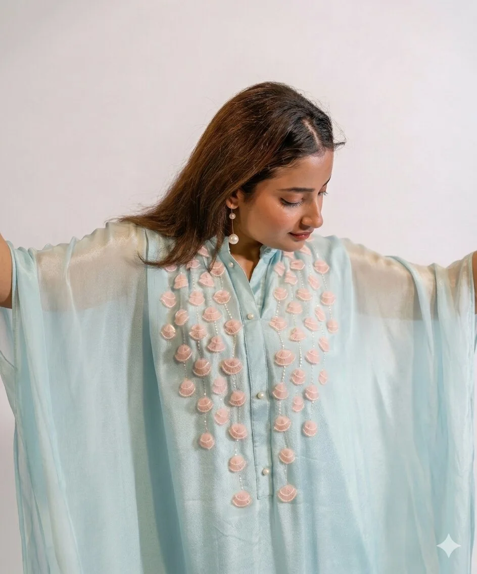 This Celeste Azure Co-Ord Set For Women is a refreshing blend of elegance and ease. The flowing kaftan style top is beautifully hand-embellished with delicate 3D motifs resembling sea shells. Paired with matching pants the outfit is a perfect pick for afternoon brunches, festive or intimate family celebrations. Light, graceful and effortlessly stylish – it’s an outfit that feels as good as it looks.