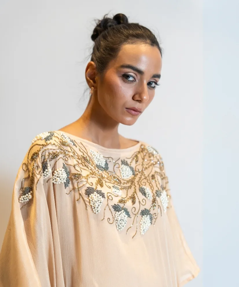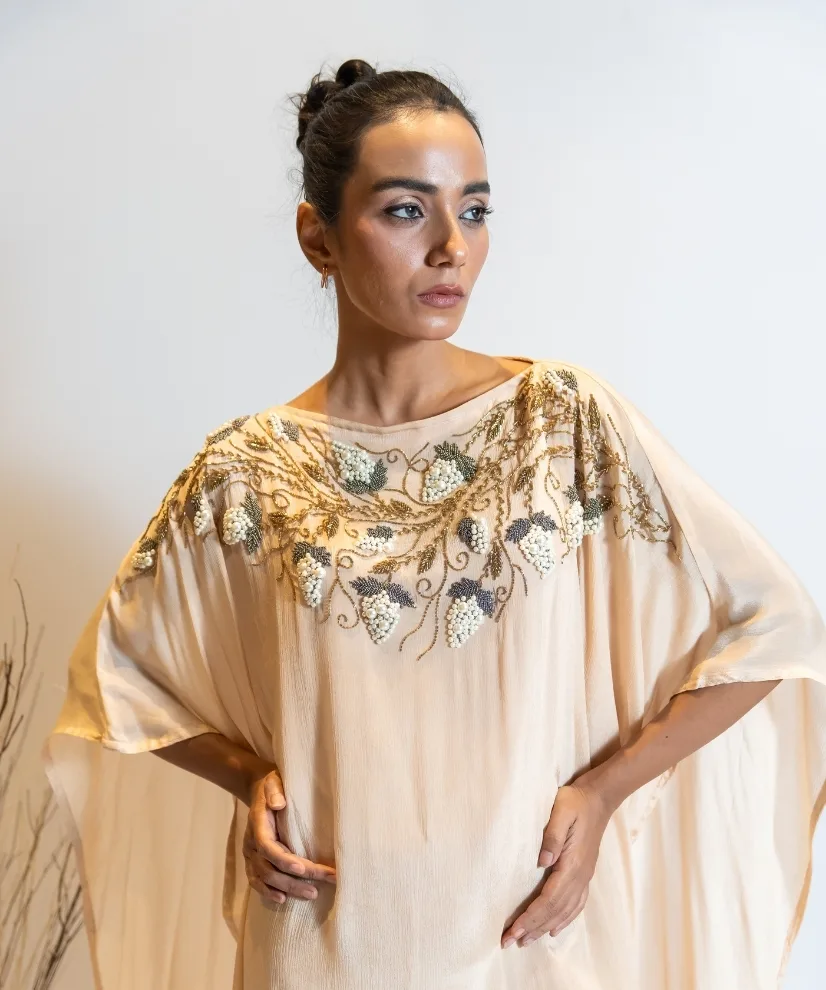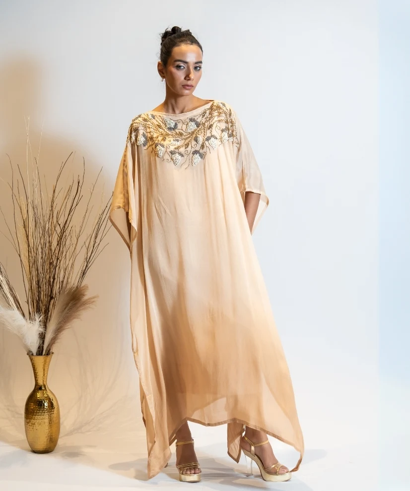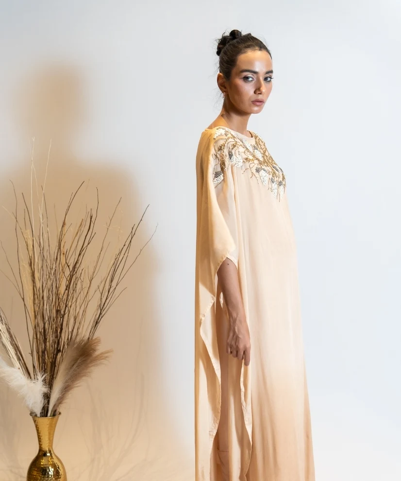 Softly sculpted in premium georgette with a gentle champagne-to-beige ombré, this 1-piece kaftan dress is the epitome of understated elegance. The neckline is richly adorned with hand embroidery and metallic embellishments, while a santoon lining ensures graceful comfort. Ideal for pre-wedding dinners, festive evenings, or moments that call for effortless radiance.