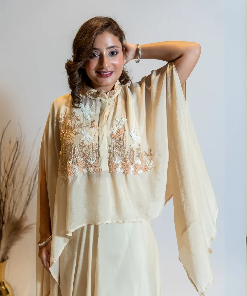 Elegant yet effortlessly fluid, this 3-piece co-ord set in soft champagne ivory georgette features a flowy skirt, bustier top, and an embroidered cape-style overlay. The hand embroidery across the front is a delicate blend of pastel threads and embellishments, adding a refined touch to the airy silhouette. Perfect for pre-wedding brunches, cocktail evenings, or any occasion where you want to radiate subtle sophistication.