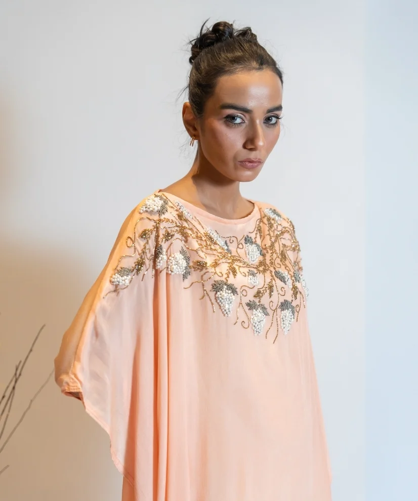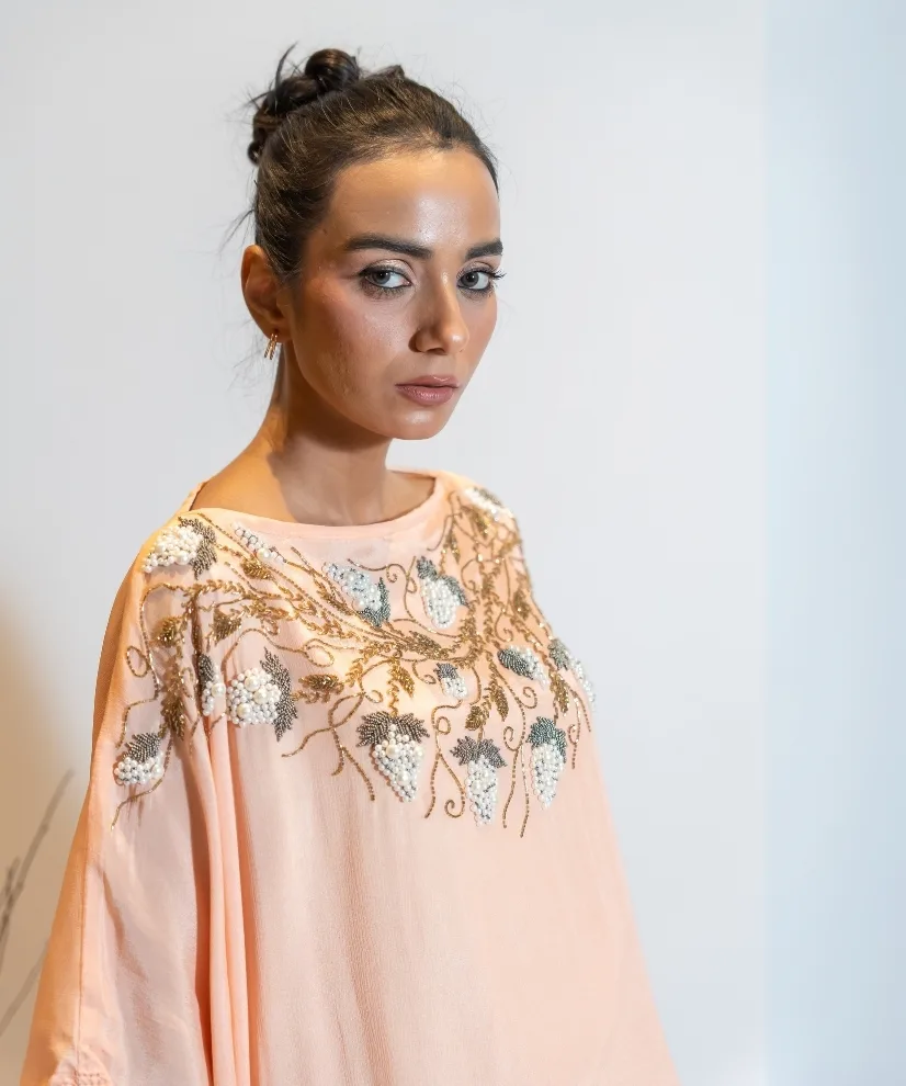 Flowy, feminine, and full of glow — this 1-piece kaftan dress in a coral-to-salmon peach ombré is crafted from premium georgette with a soft santoon lining for breezy comfort. The neckline is rich with hand embroidery and sequin embellishments, making it the perfect choice for pre-wedding events, sundowner parties, or intimate celebrations with a dash of glamour.