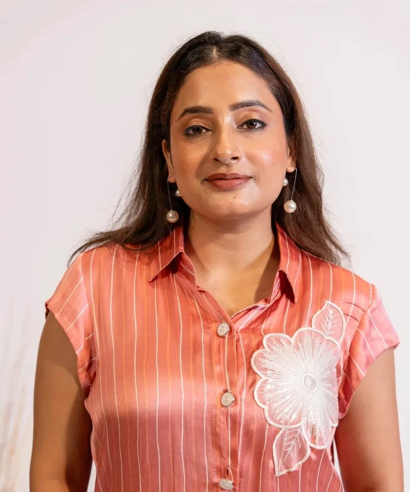 Add a touch of elegance to your everyday wardrobe with this coral satin co-ord set. The soft sheen of the fabric gives it a luxurious feel, while the hand-embellished white floral motif made from delicate moti and katdana work makes it a true master piece. Paired with matching pants the outfit is a perfect blend of chic and effortless style. Ideal for casual brunches, semi-formal gatherings or for occasions when you want a polished yet relaxed look.