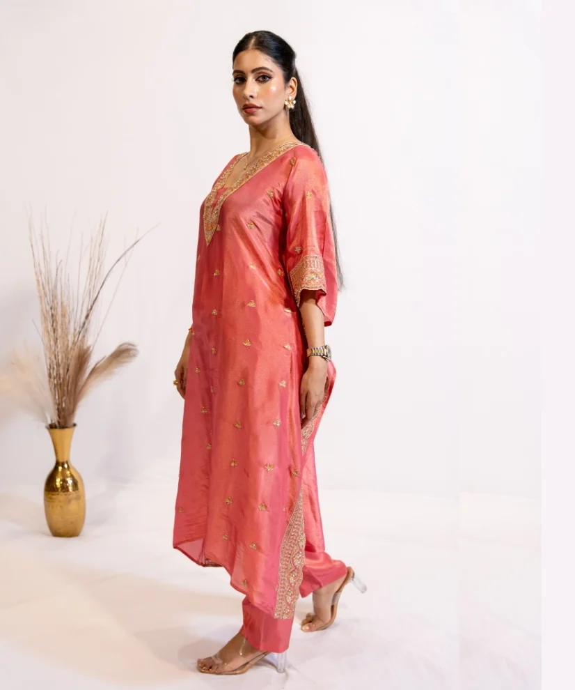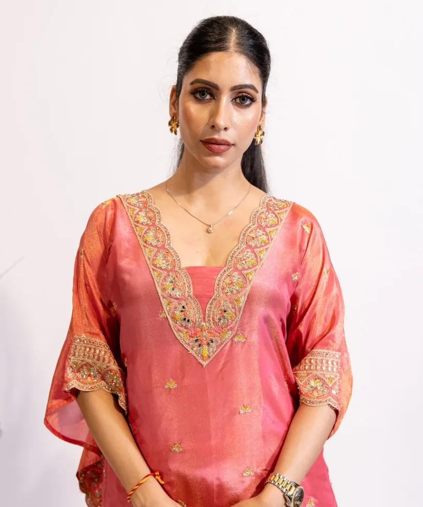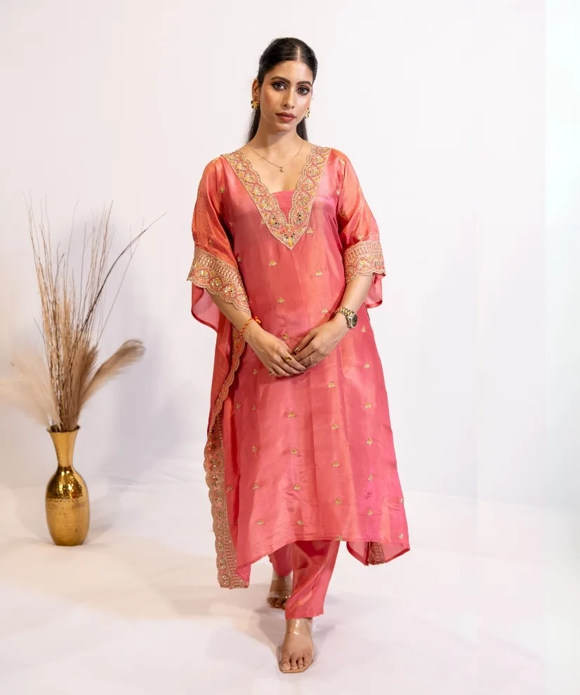 Fabric: Tissue | 2 piece set with Kaftan Style Kurta & Pants | Color: Coral Pink