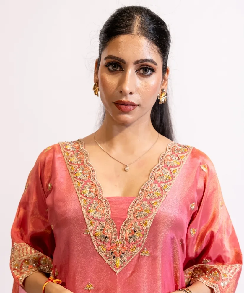 Drape yourself in festive elegance with this Coral Pink Tissue Kaftan Kurta Set. The rich tissue fabric lends a subtle sheen to the dress, while intricate embroidery on the neckline and borders add to it’s feminine appeal. The 2 piece set includes a flowing kaftan-style kurta paired with matching bottoms, blending comfort with luxurious charm. It’s an ideal choice for any festive gathering or wedding functions