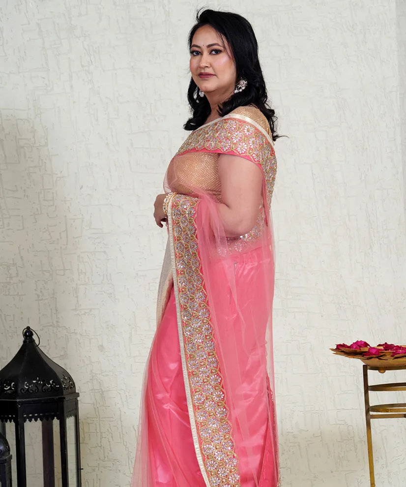 Fabric: Soft Net | Weave: Aari Zardozi Hand Embroidery | Color: Coral Rose | Blouse: None – Style it with a designer blouse of your choice!