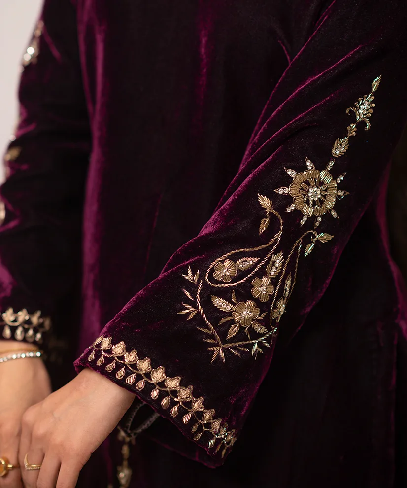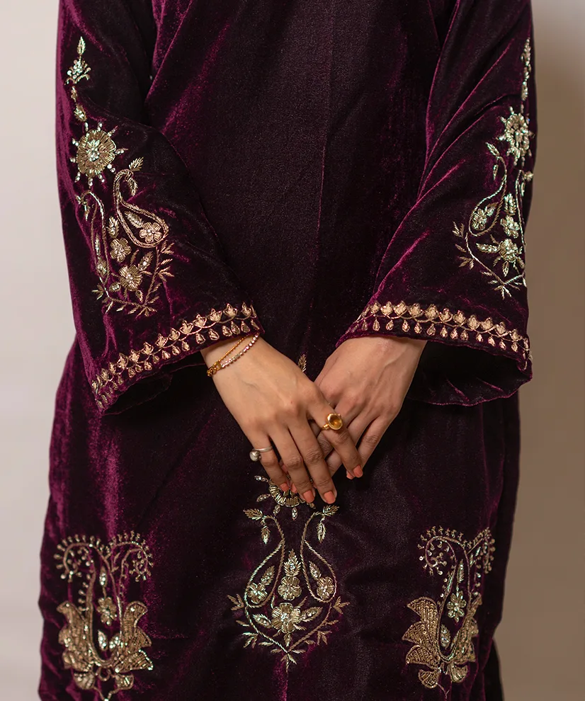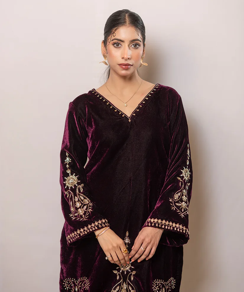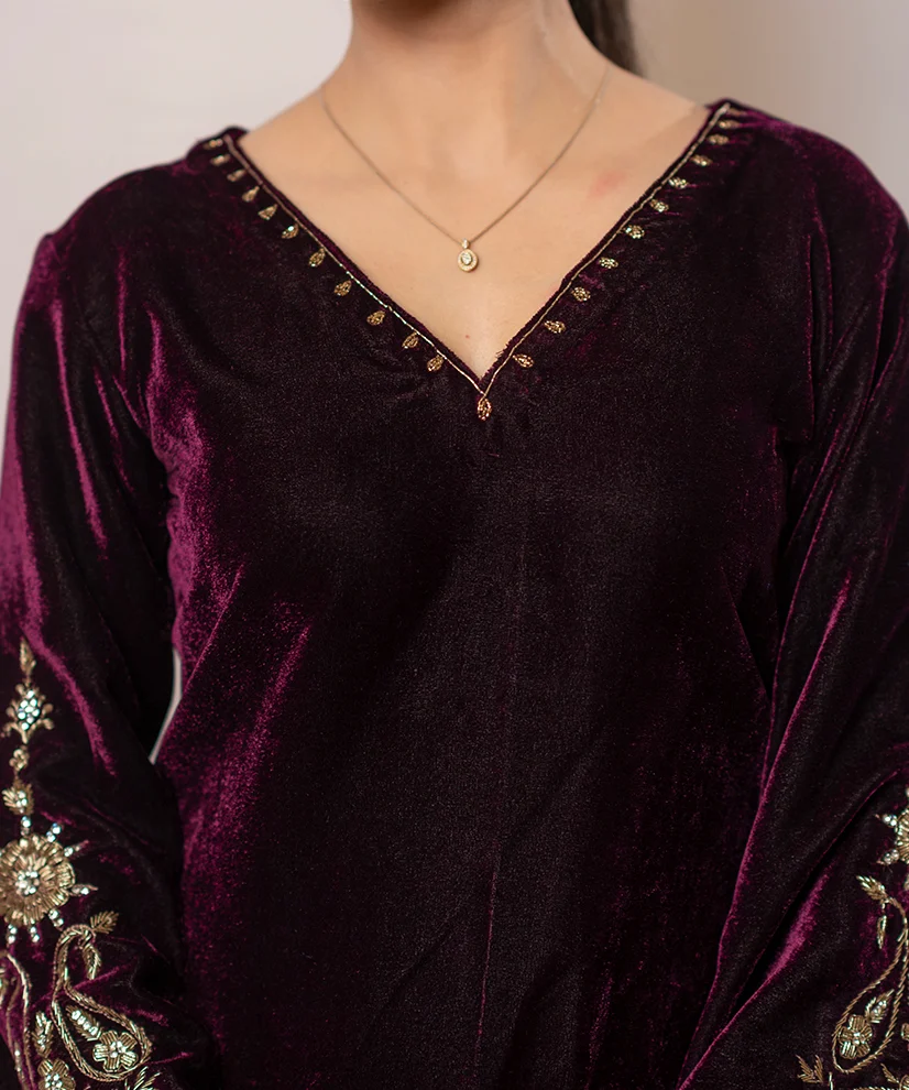 Crafted in plush velvet, this deep wine co-ord set is a celebration of understated opulence. The kurta and sleeves are adorned with intricate Aari Zardosi royal motifs, lending a soft shimmer against the rich, jewel-toned base. Designed for evenings that call for elegance without excess, this set blends timeless craftsmanship with a contemporary silhouette—perfect for parties, festive gatherings, and refined soirées.