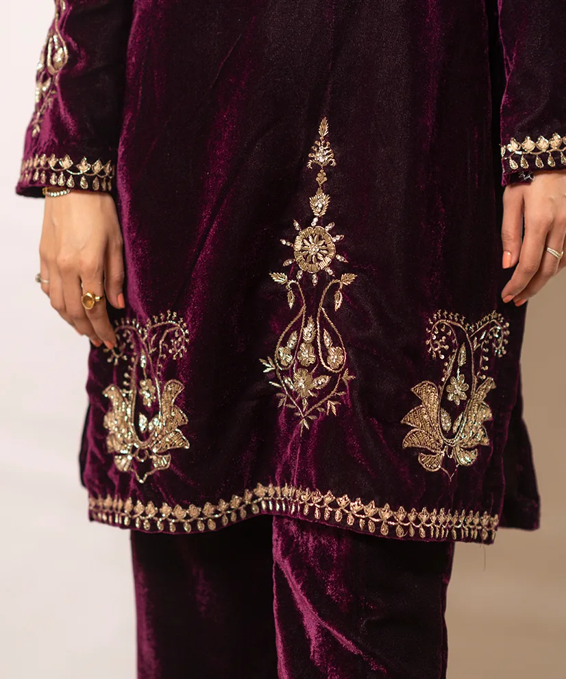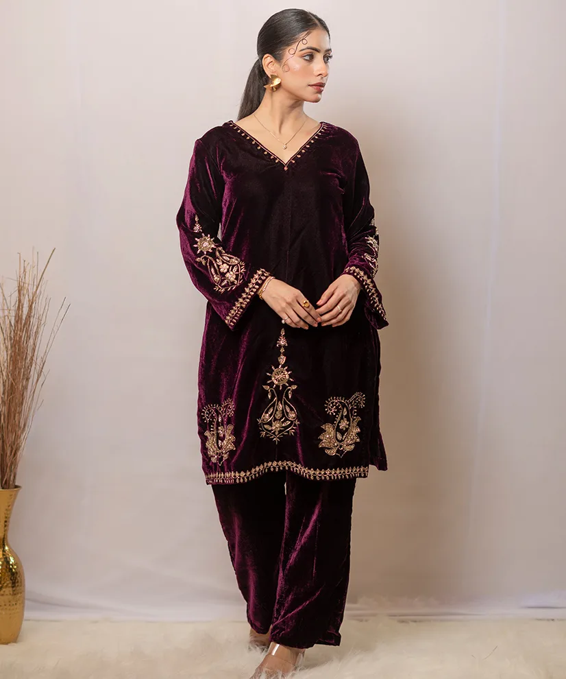 Fabric: Velvet | Color: Wine / Dark Purple | 2 Piece Set – Top & Pant