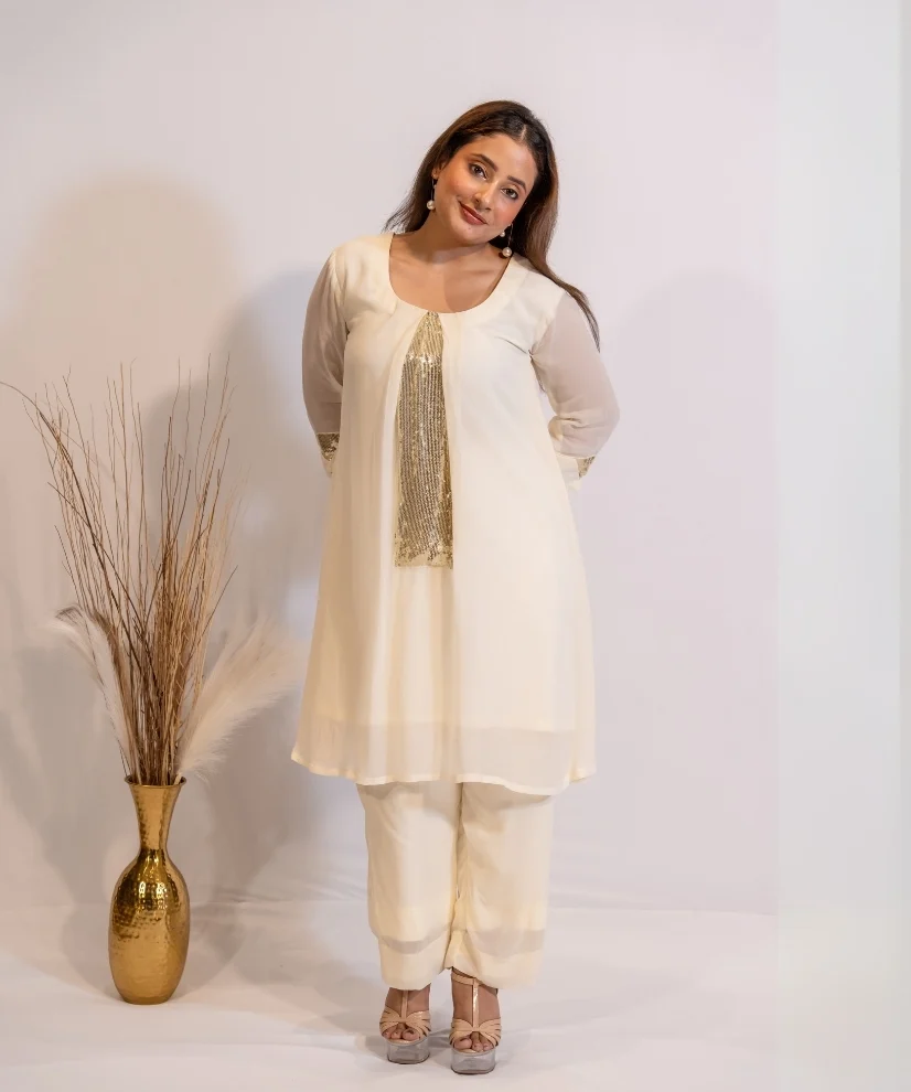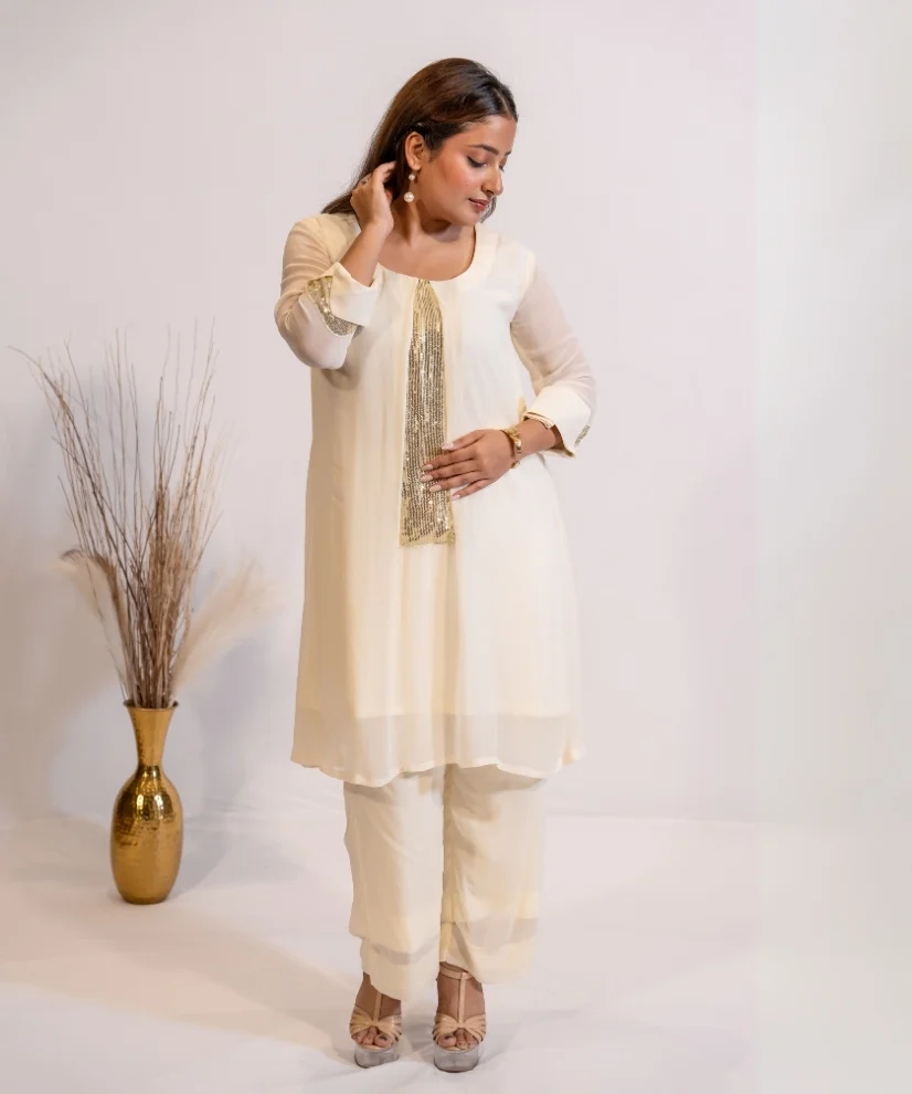Crafted in a soft, flowing fabric with a subtle sheer finish, it features a straight-fit top paired with matching pants. The highlight is the silver sequin-embellished panel runs down the front, adding just the right amount of glamour to the outfit. Lightweight & breathless the Co-ord Set is the pefect choice for cocktail evenings, festive gatherings or intimate celebrations