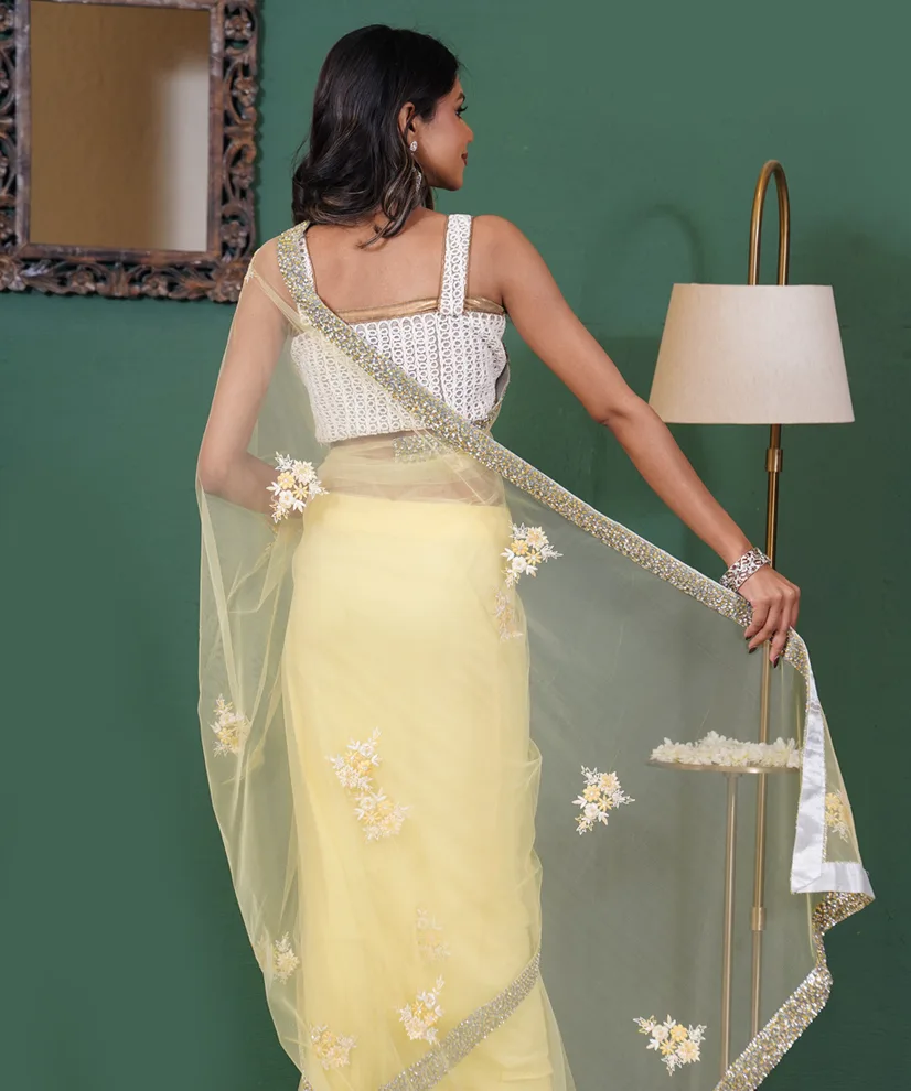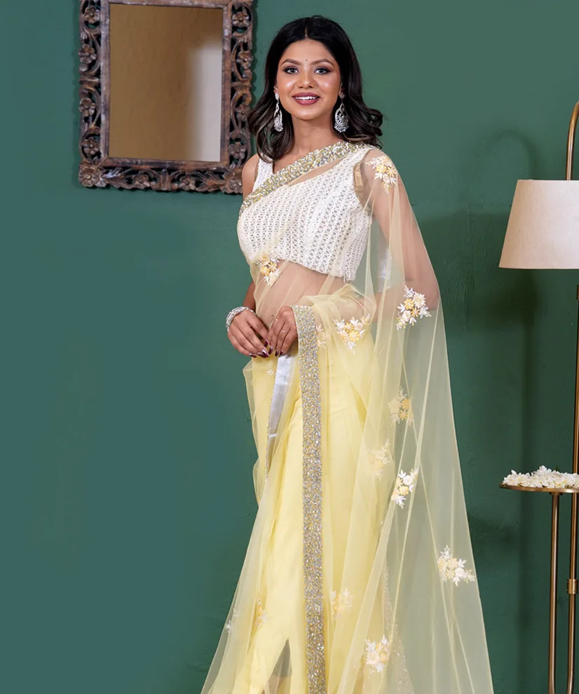 Fabric: Net | Weave: Aari Zardozi Hand Embroidery | Color: Pastel Yellow | Blouse: None