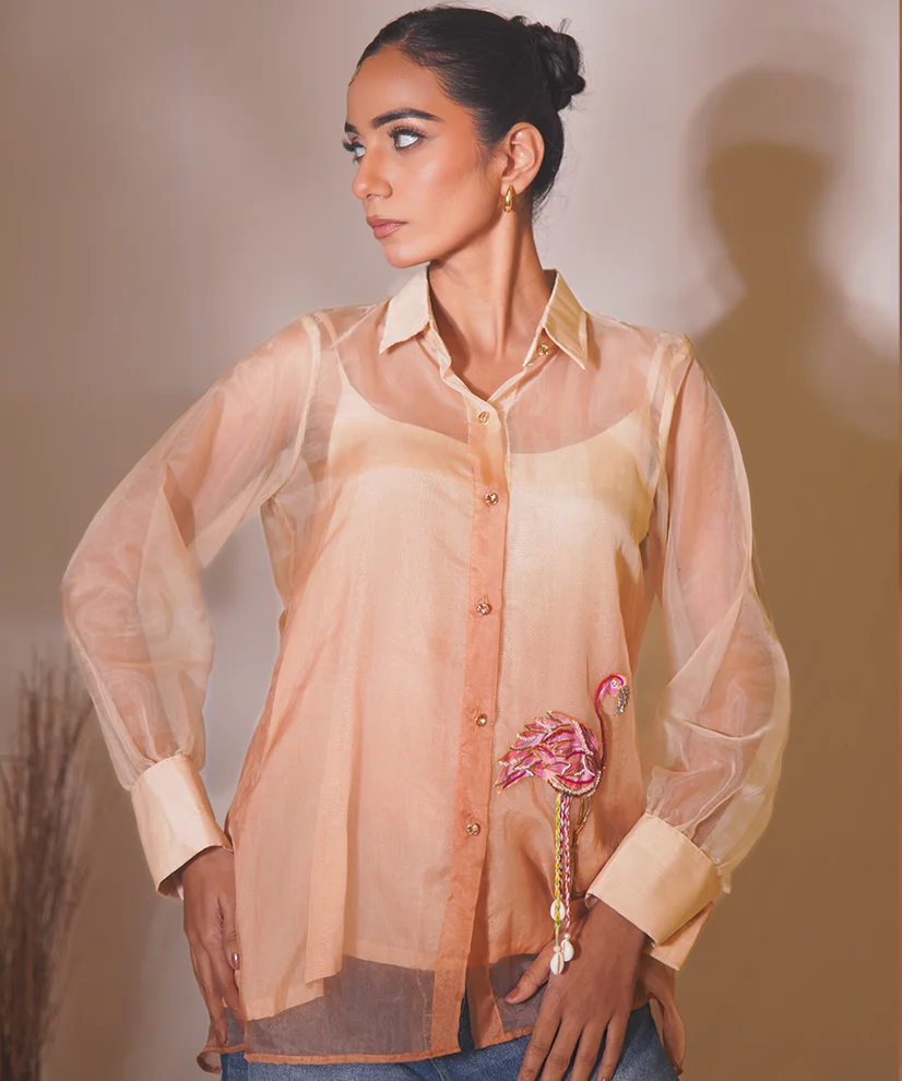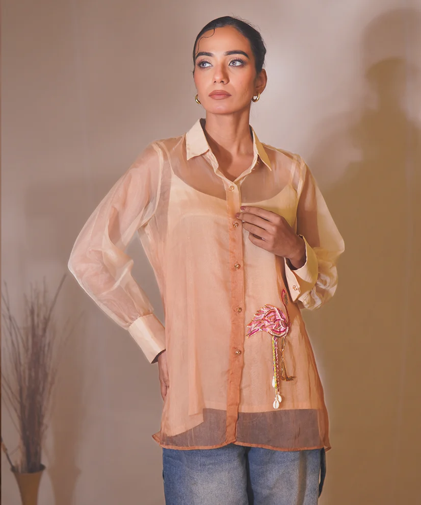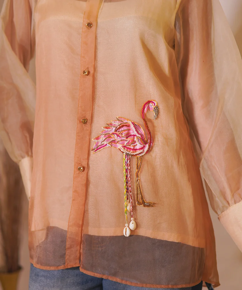 A delicate blend of artistry and ease, this ombre beige organza shirt is crafted for effortless elegance. Featuring a hand-painted flamingo motif accentuated with katdana and shell embellishments, the sheer organza overlay is paired with a soft cotton silk inner for comfort and structure. Light, graceful, and quietly statement-making, this piece is perfect for refined festive moments and elegant social gatherings.