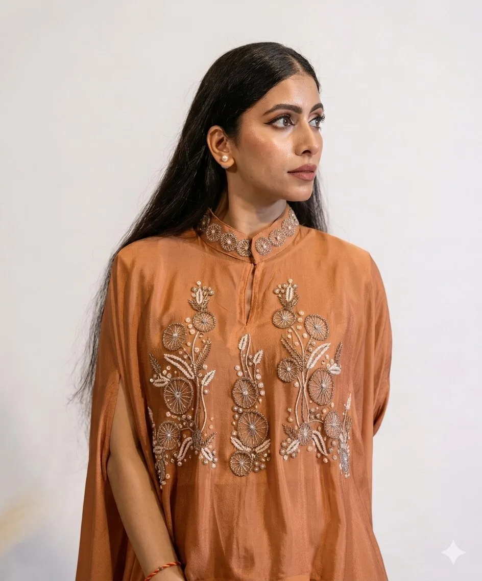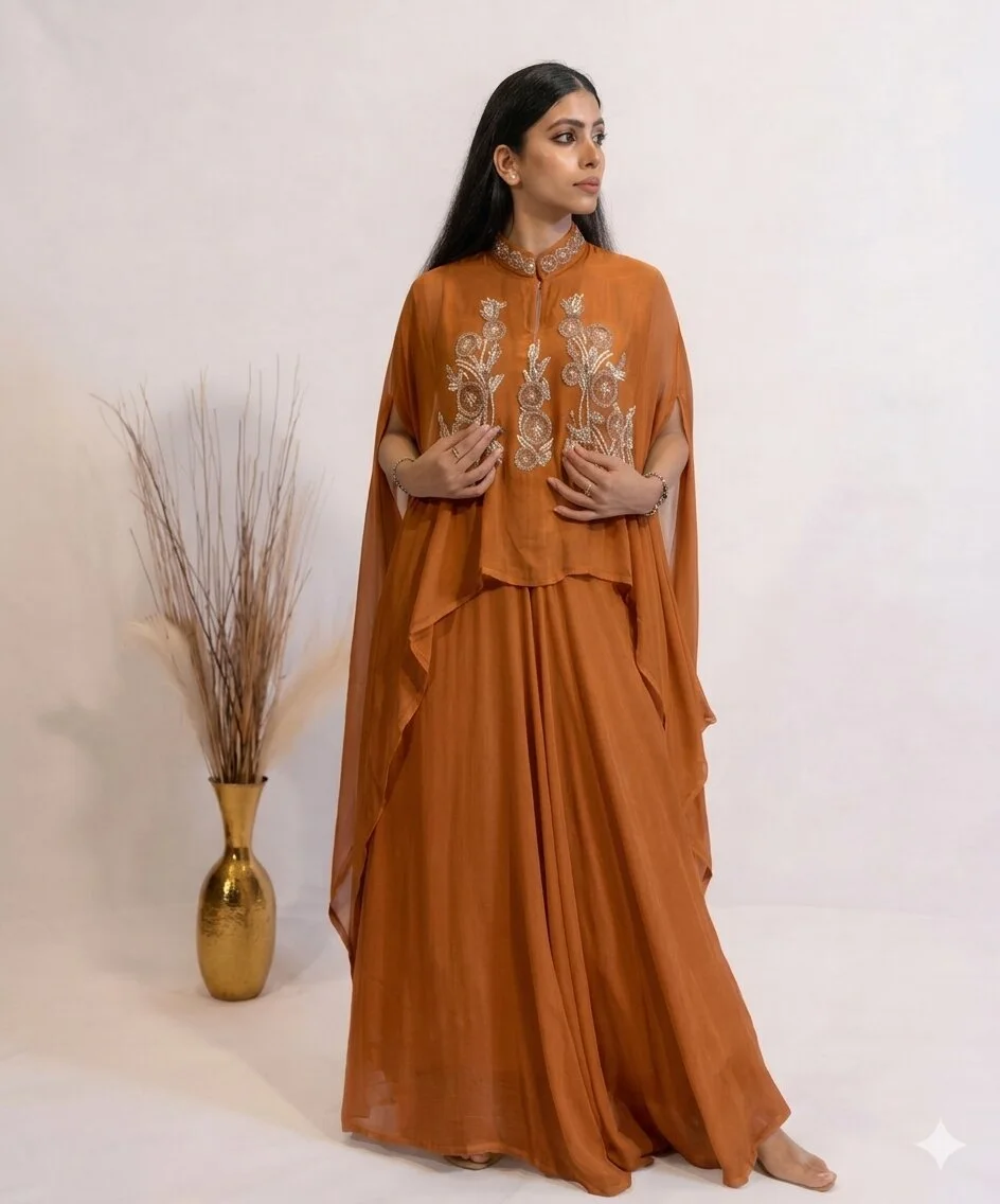 Effortlessly elegant, this Ginger Spice Hand-Embellished 3-Piece Co-Ord Set For Women is a vision of refined glamour. The co-ord set is made from soft georgette fabric and feels like butter against the skin. The subtle shimmer of the champagne colour and rich embroidery detailing on the top, make the outfit a perfect blend of sophistication and grace. Designed for women who appreciate timeless fashion with a modern edge, this ensemble is ideal for cocktail evenings, festive gatherings, or celebrations where you want to stand out.
