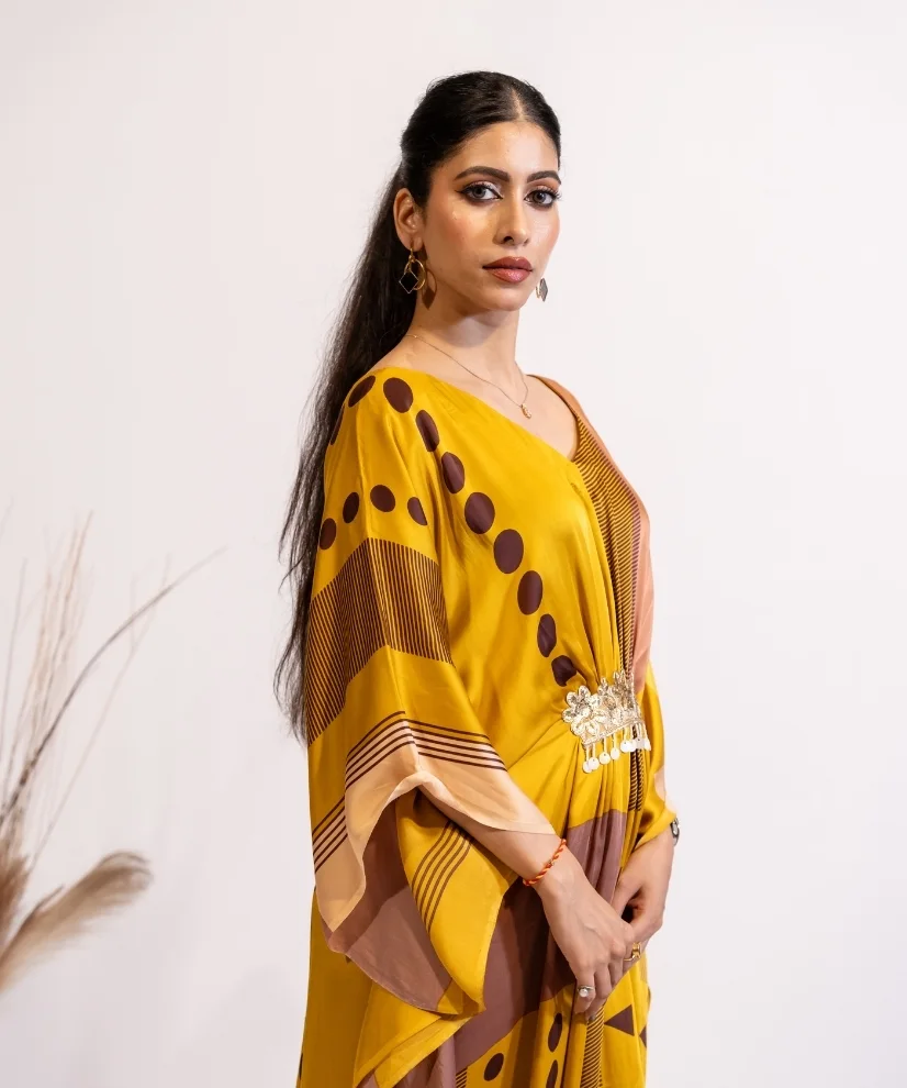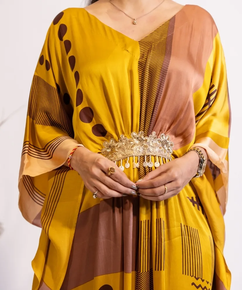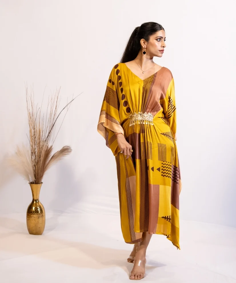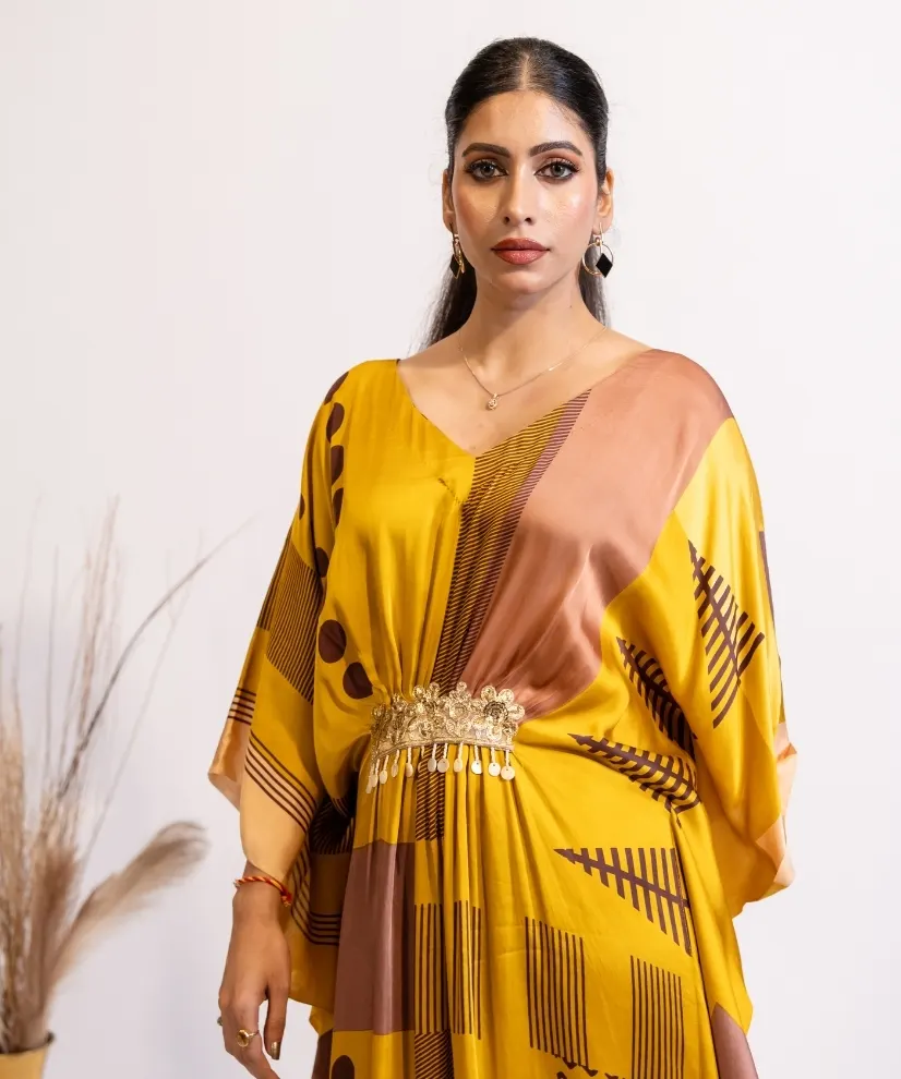 Turn heads in this mustard and ochre abstract print kaftan dress. Crafted from premium satin fabric, the dress feels like butter against the skin. Bold geometric patterns, soft sheen of the fabric & a waist line hand embellished with golden lace detail – make the outfit an absolute winner. It’s airy, free flowing and versatile – making it a perfect choice for cocktail evenings, festive gatherings and weekend getaways