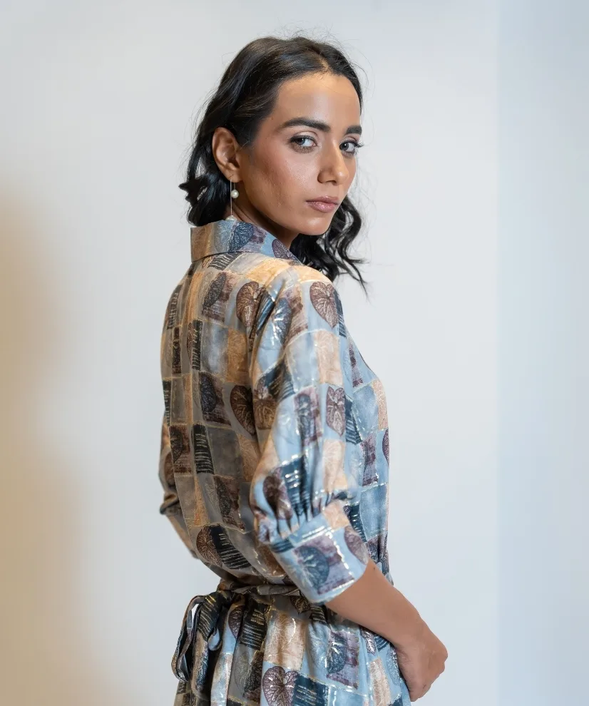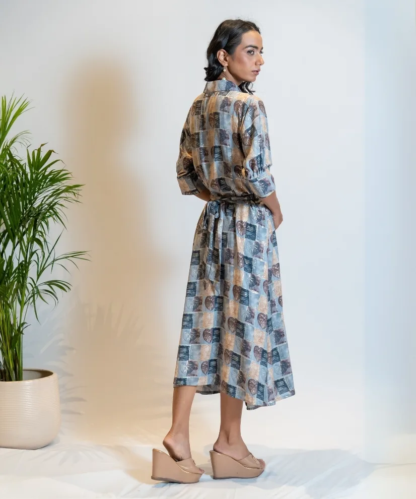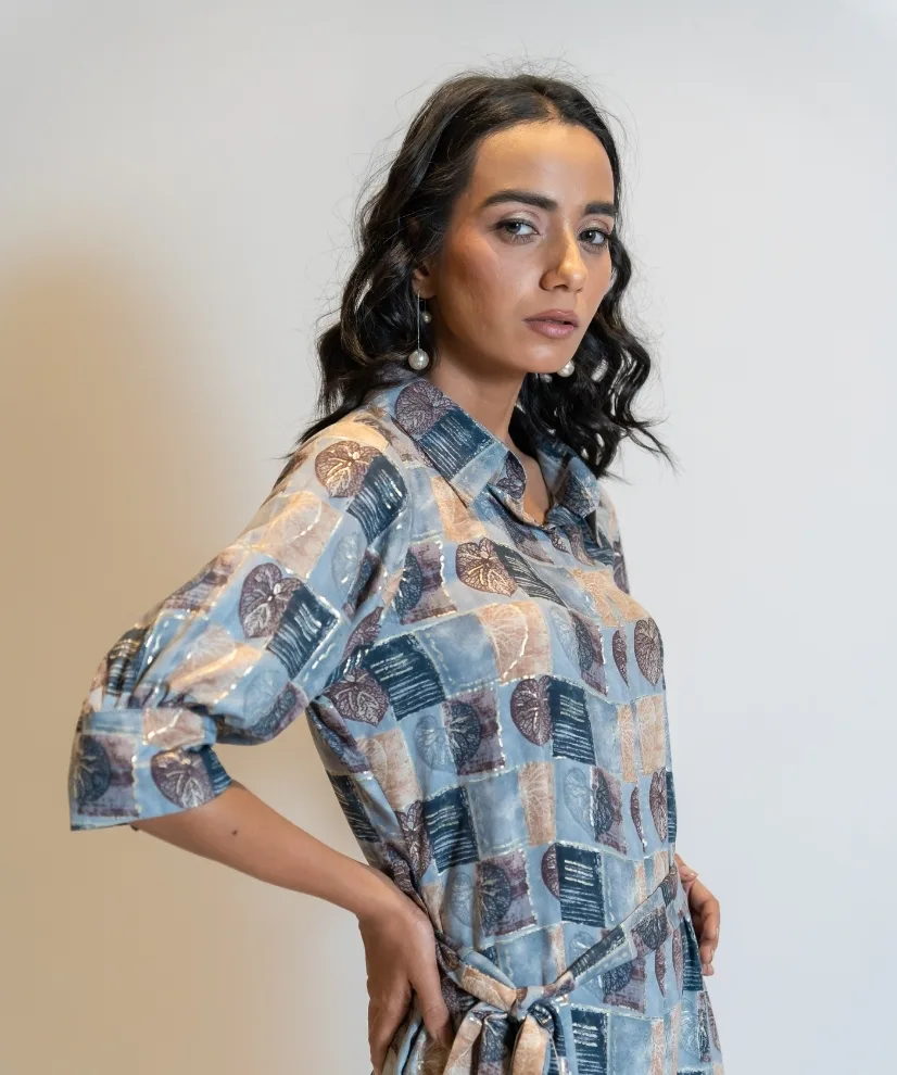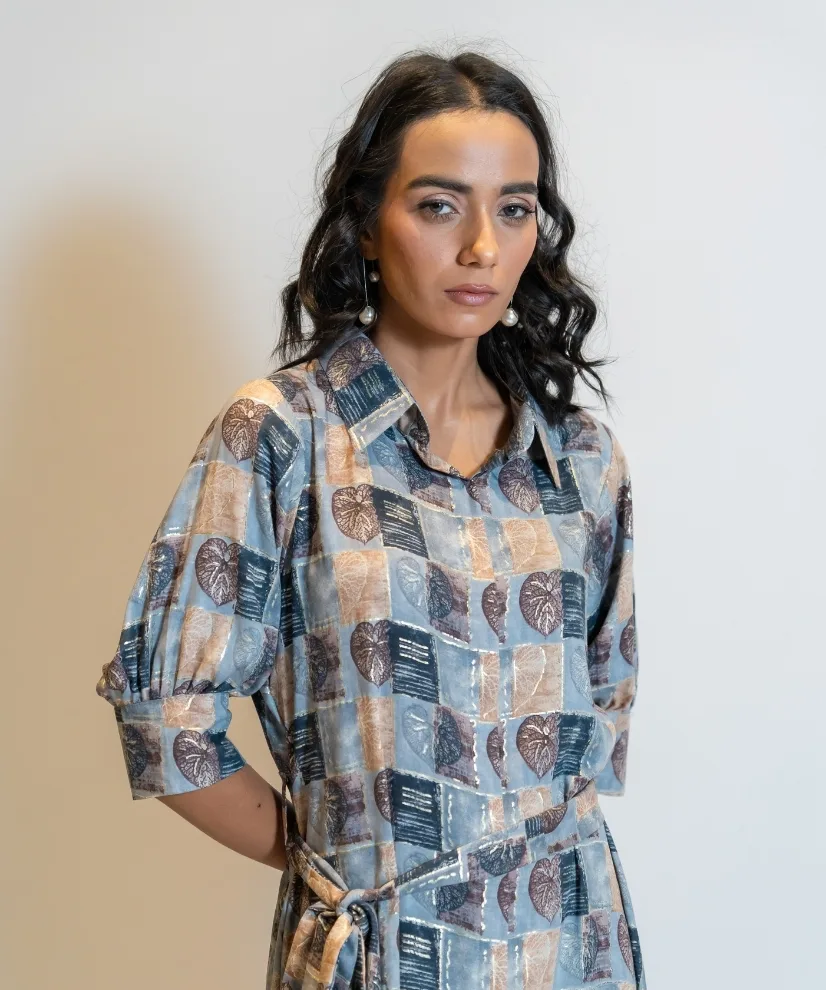 Moody yet minimal, this 1-piece cotton-linen shirt dress in dusty steel grey features soft leafy prints and a flattering belt tie-up. With its collared neckline, half sleeves, and earthy palette, it’s perfect for slow evenings, city strolls, or when you want to feel quietly stylish and grounded.