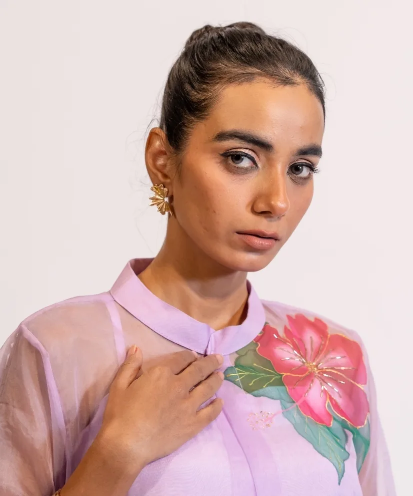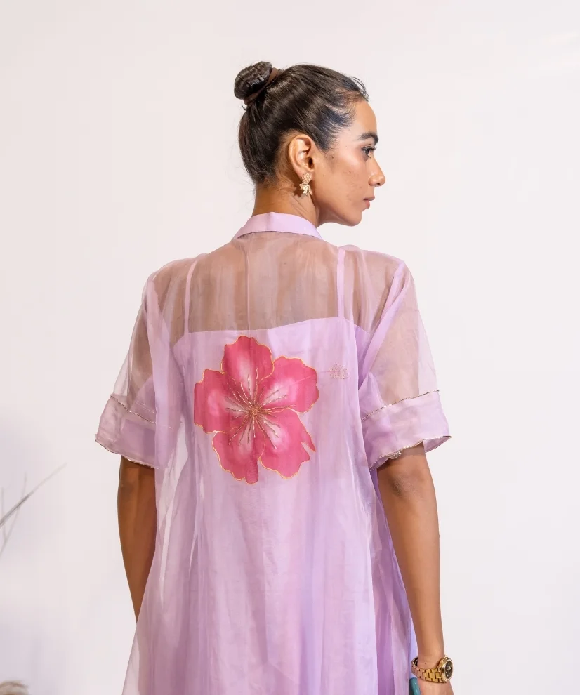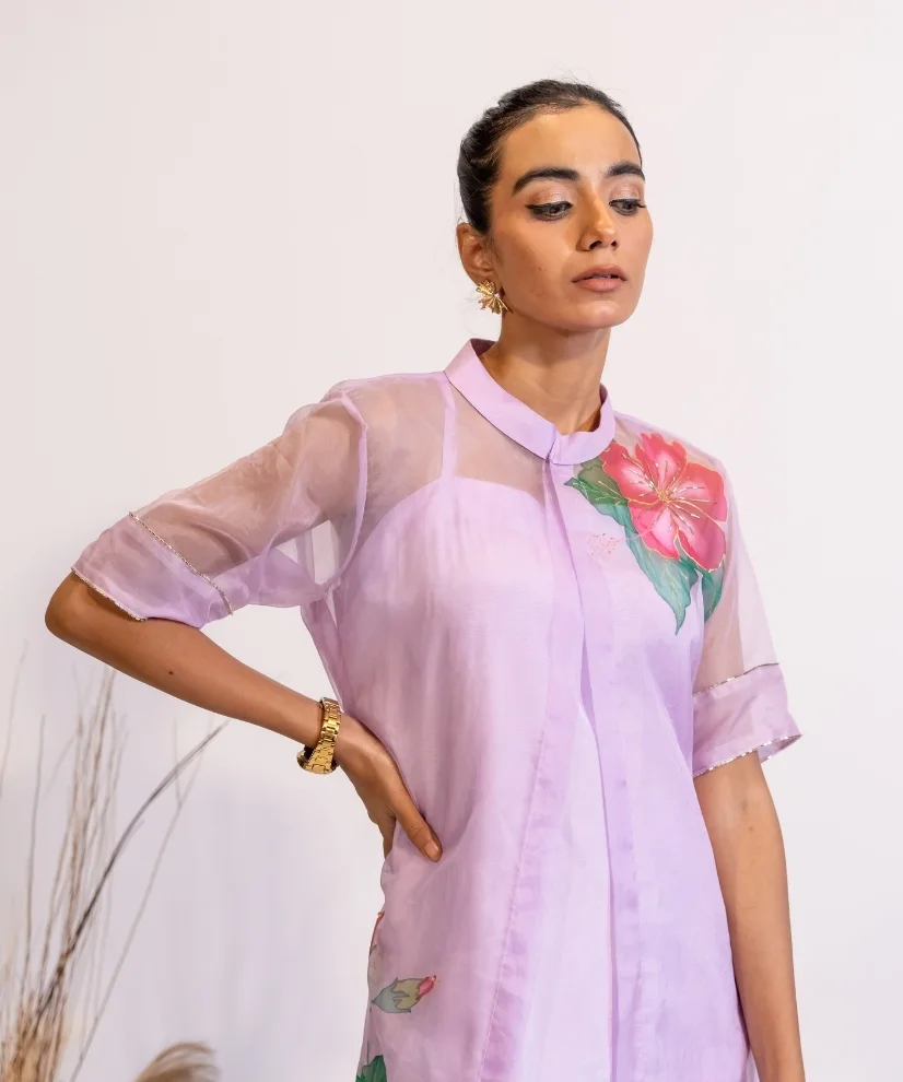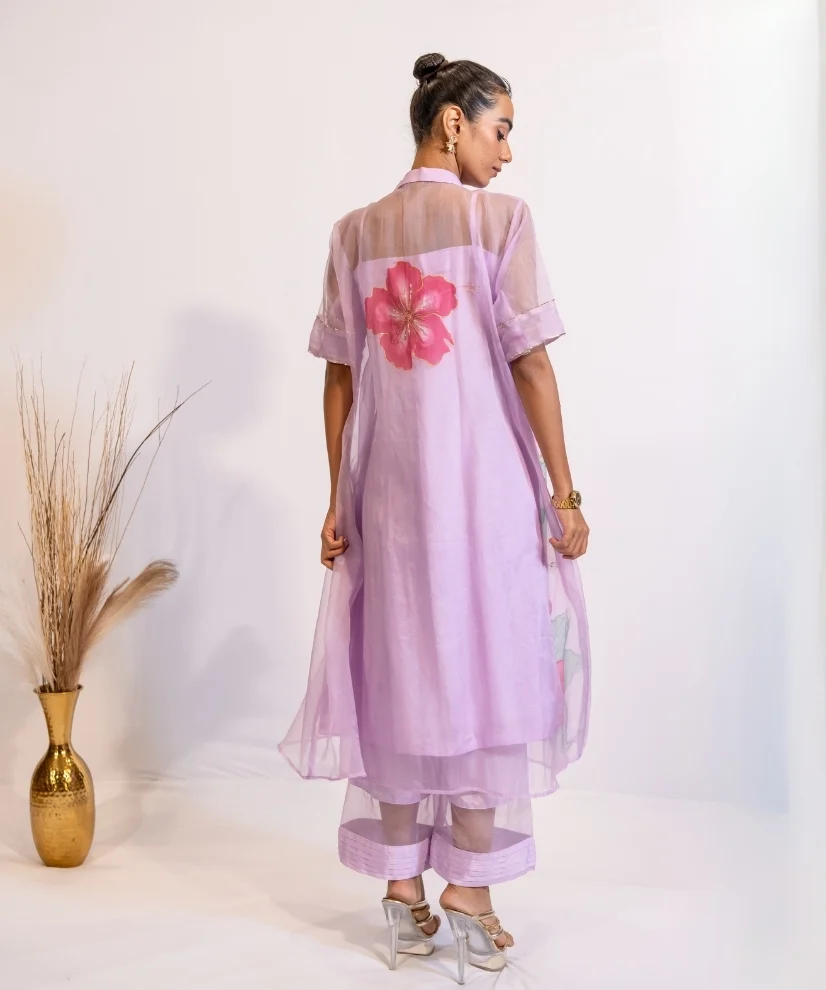 Add a touch of hand painted elegance to your wadrobe with this dreamy lavender organza kurta set. Hand-painted floral bloom pattern on the front and back of the organza shrug, enhanced by delicate katdana embellishments add just the right touch of glamour to the outfit. The set comes with matching inner cotton silk kurta and pants. A blend of art and craftsmanship, the outfit is a statement piece for any occasion, be it Sunday brunches, cocktail evenings or festive gatherings !