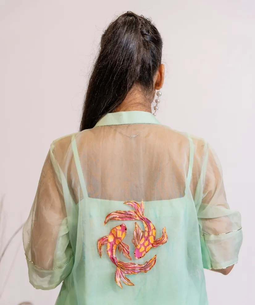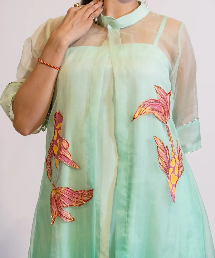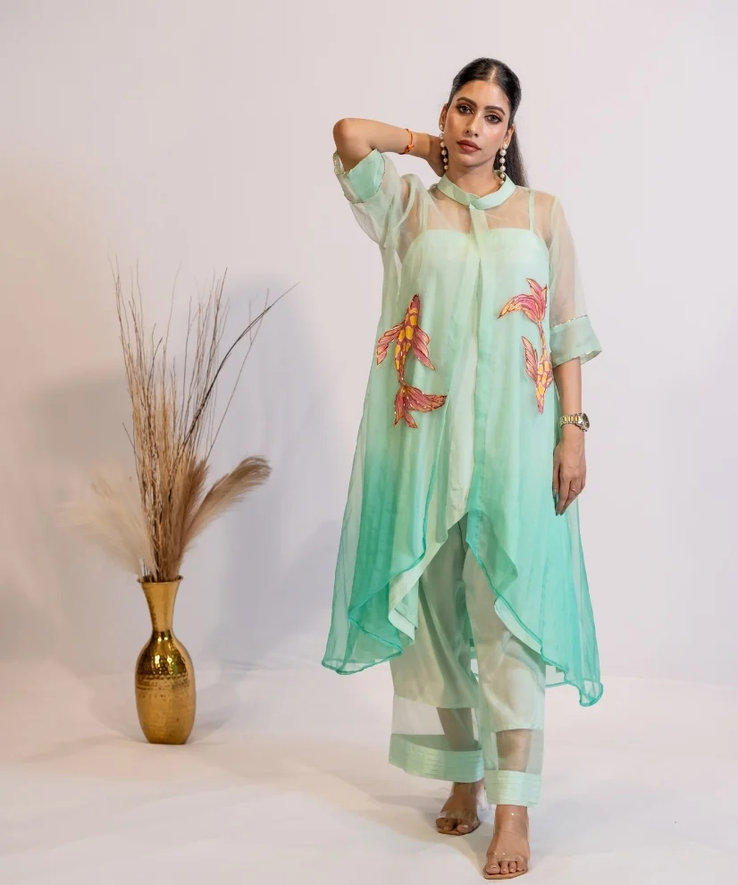 Step into elegance with this teal ombre organza kurta set, hand-painted with vibrant fish motifs on the front panels and back. The inner kurta & pants are made from soft and breathable cotton silk fabric. The hand-painted fish motifs on the organza shrug are accentuated by subtle katdana work, making the high-low ombre kurta set a dream outfit !