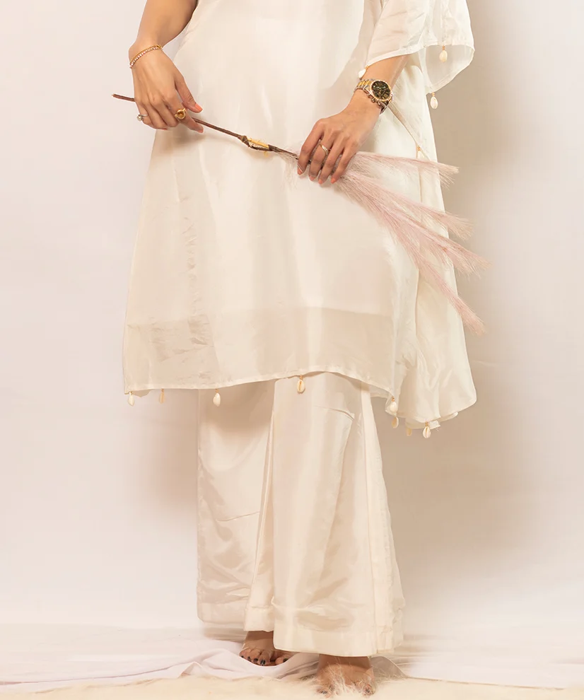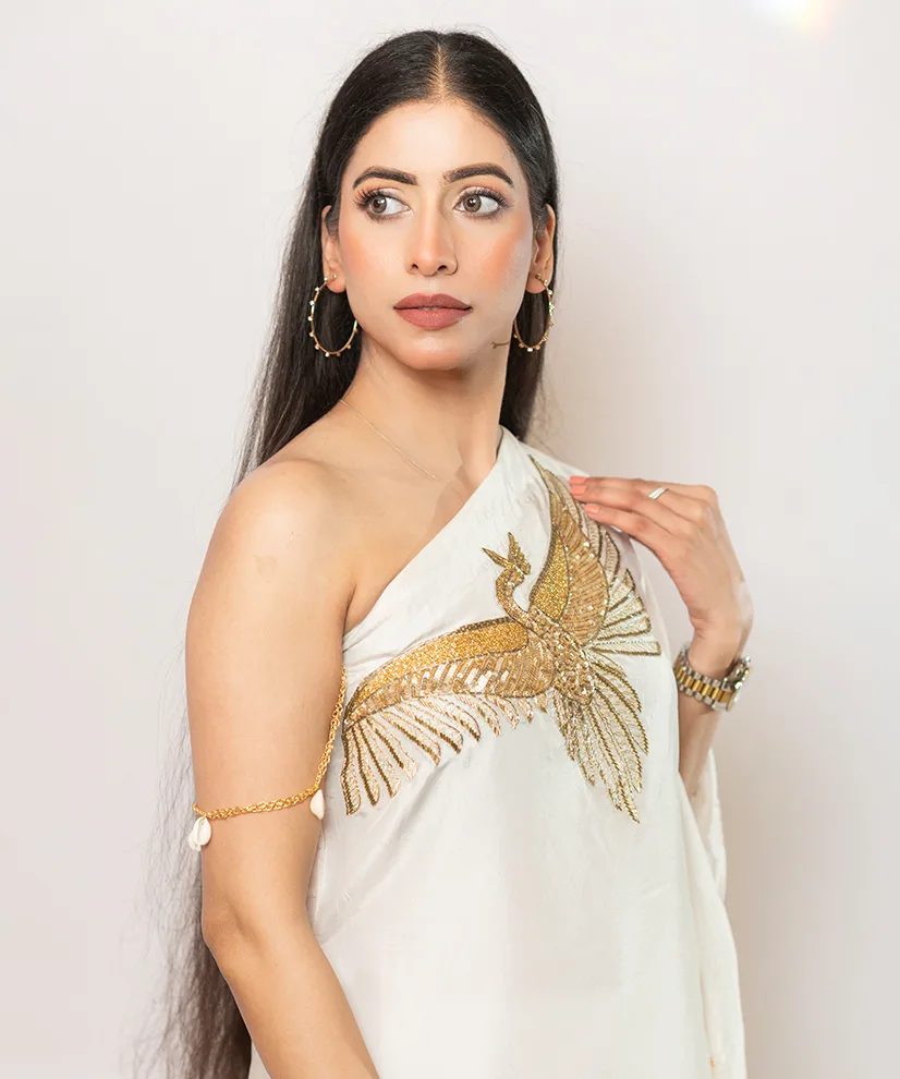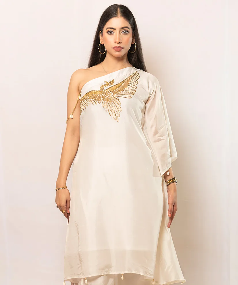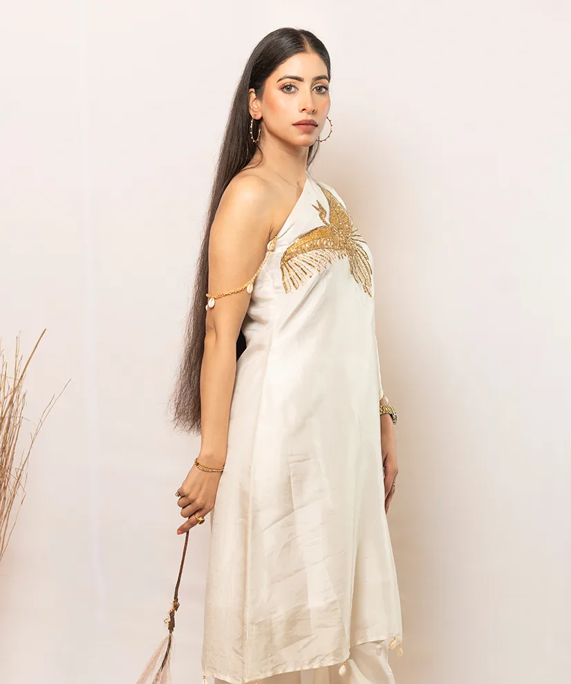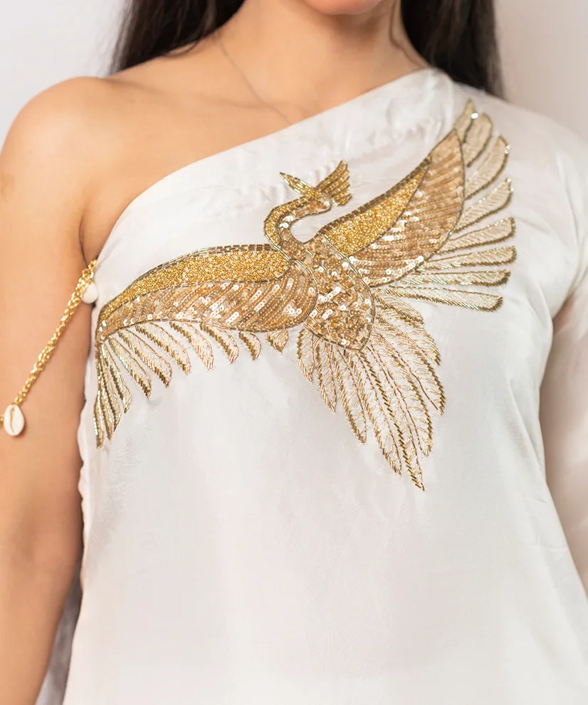 Crafted in fluid ivory-toned Upada silk, this co-ord set features a striking one-shoulder silhouette highlighted by a dramatic handcrafted bird motif. The intricate Aari Zardosi embroidery lends sculptural depth, transforming the piece into a wearable work of art. Lightweight yet luxurious, it is designed for women who appreciate understated glamour with a bold point of view.