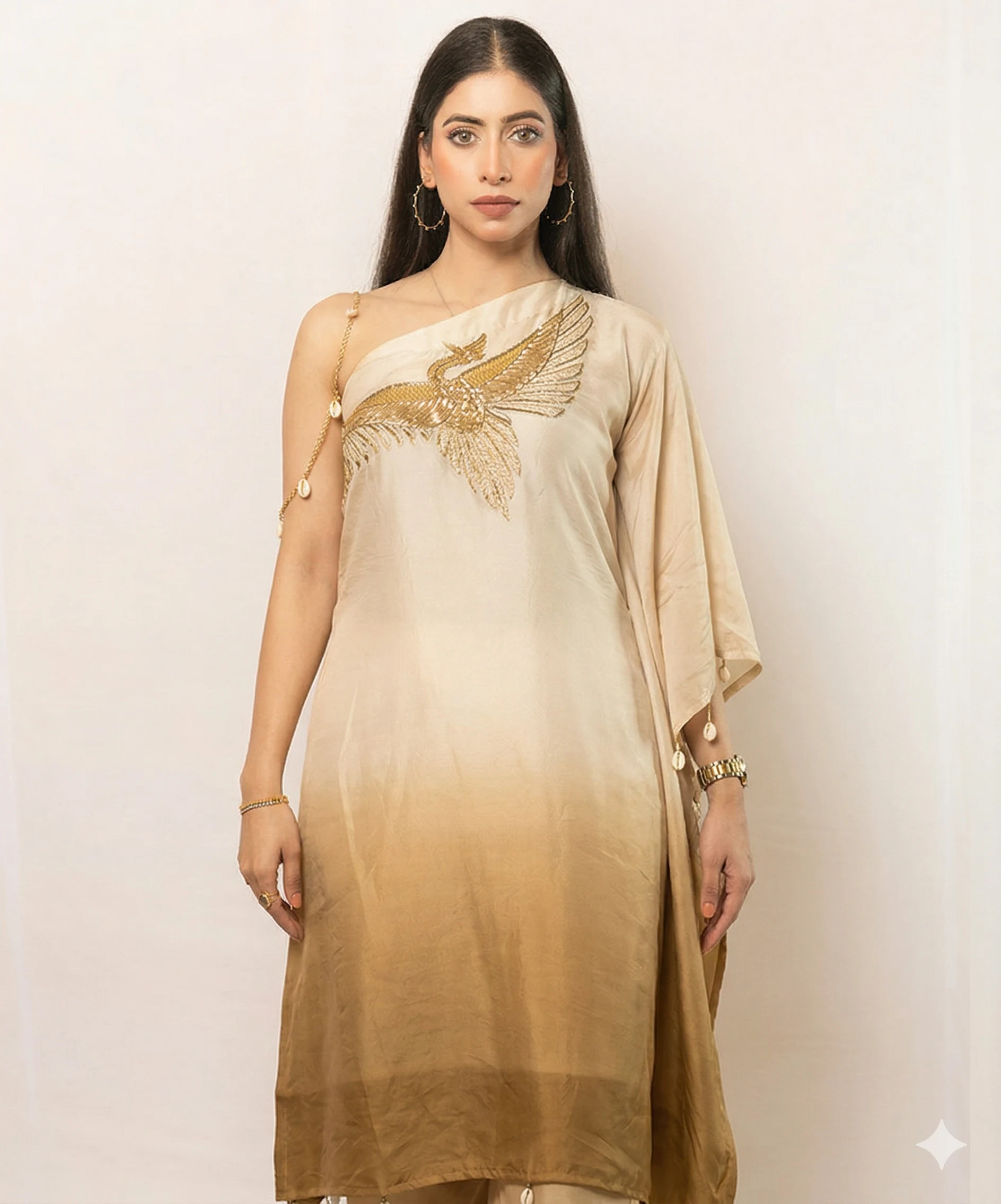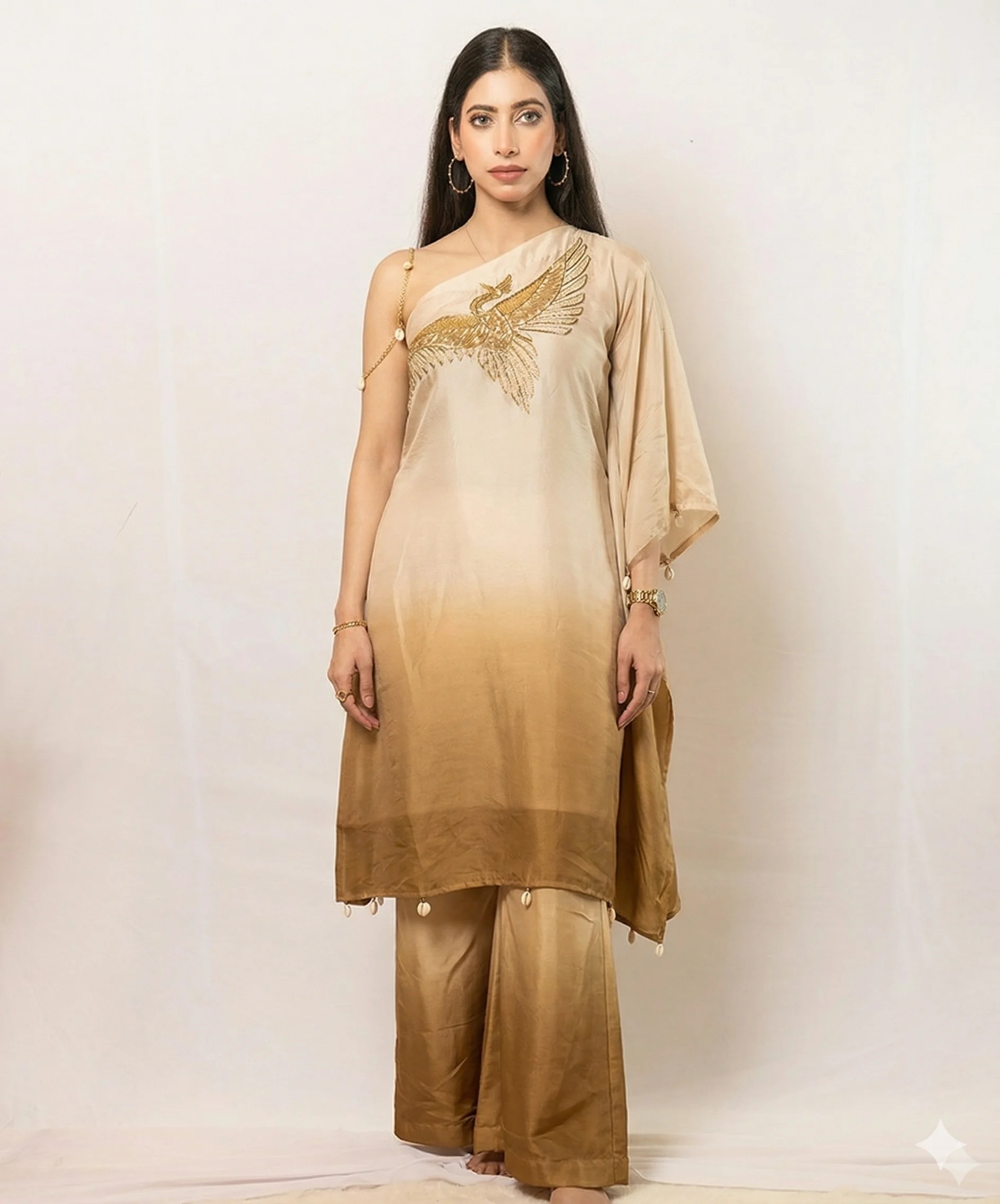 Crafted in fluid Ivory Light Brown Flight One-Shoulder Co-ord Set For Women-toned Upada silk, this co-ord set features a striking one-shoulder silhouette highlighted by a dramatic handcrafted bird motif. The intricate Aari Zardosi embroidery lends sculptural depth, transforming the piece into a wearable work of art. Lightweight yet luxurious, it is designed for women who appreciate understated glamour with a bold point of view.