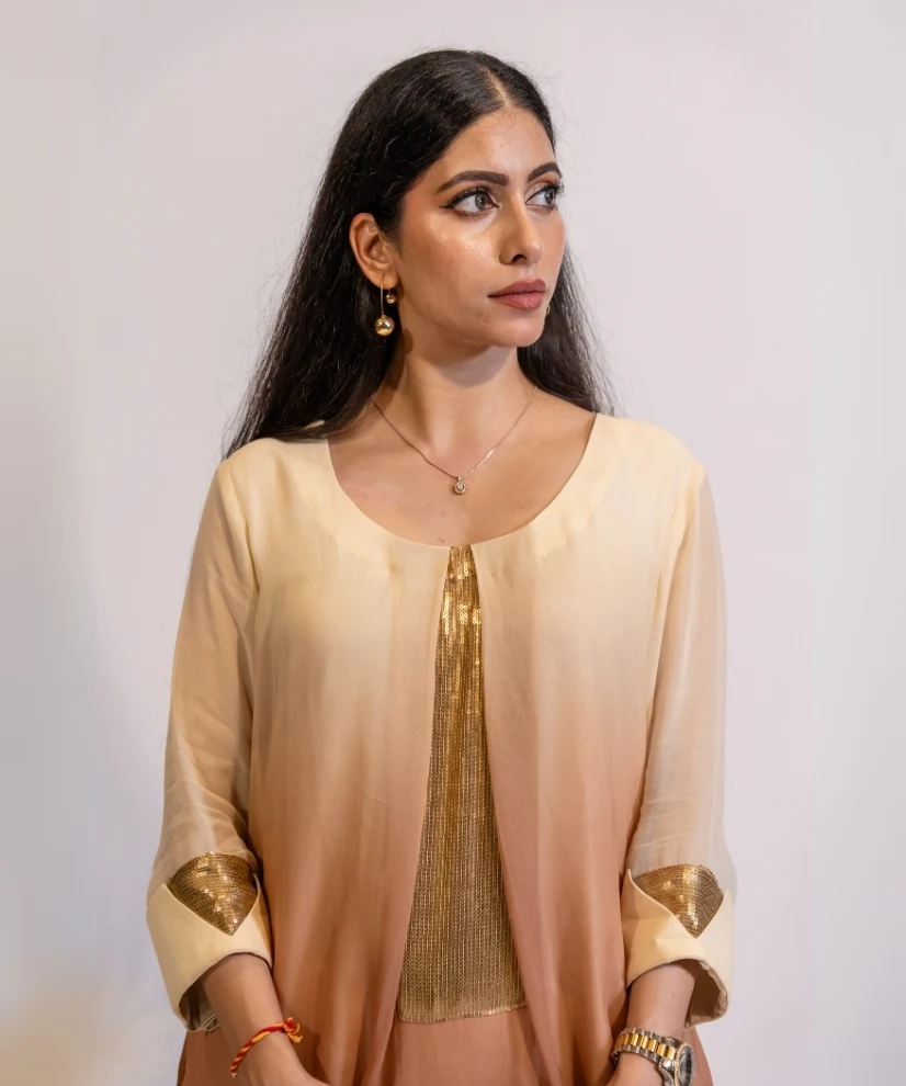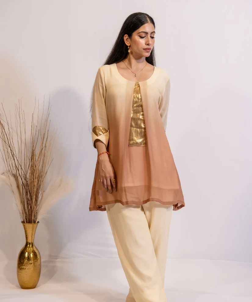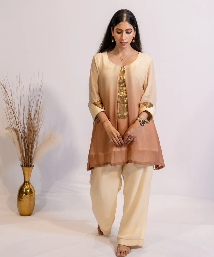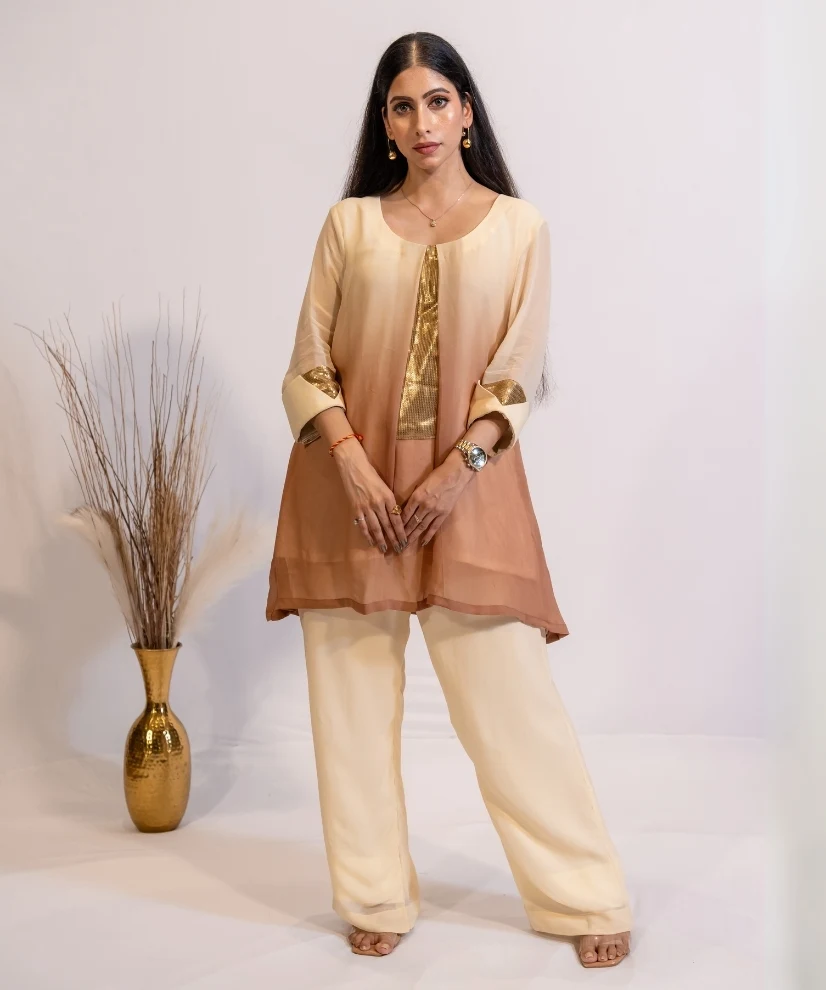 This elegant 2 piece co-ord set is crafted in lightweight georgette fabric, featuring soft ombre shading which flows from ivory cream to caramel brown. The top has a sleek round neckline accentuated with subtle gold sequence detailing. The co-ord set comes with matching Ivory pants. The outfit is easy to wear and effortlessly stylish ! It balances elegance with modern day class and sophistitcation and is ideal for light family get togethers and evening soirees