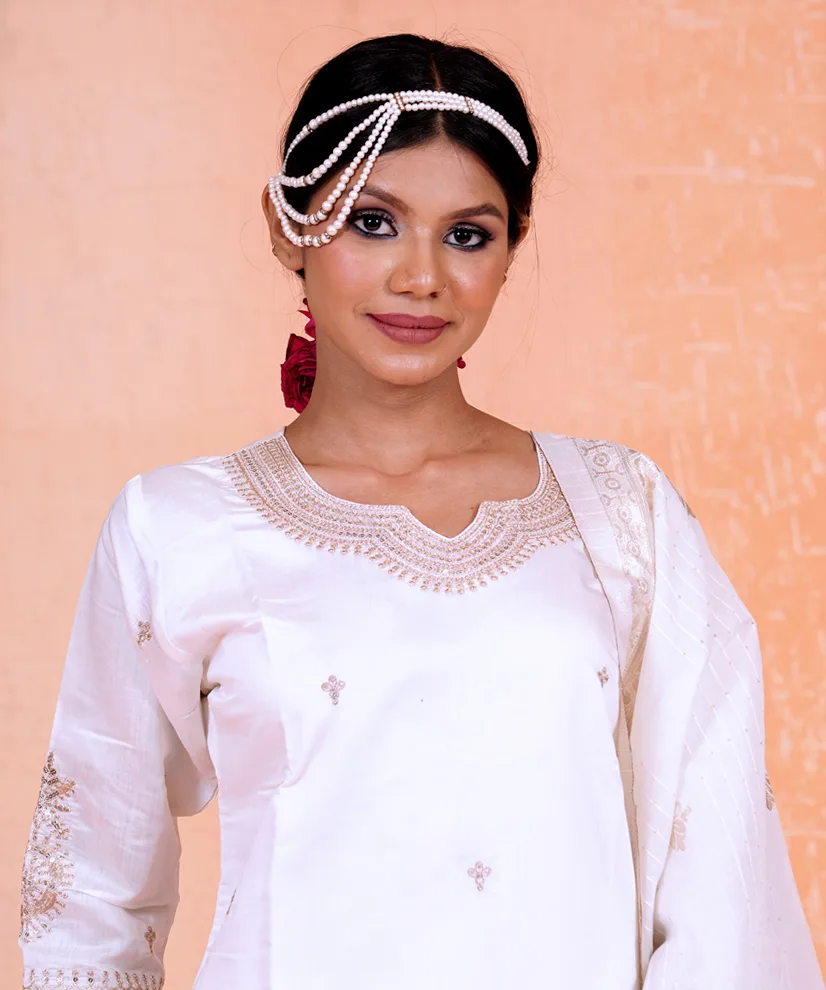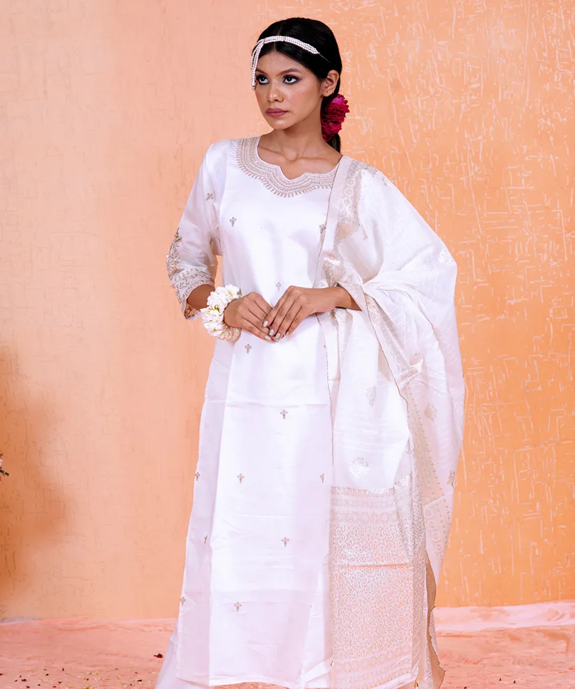 Fabric: Viscose Roman Silk Kurta & Pant Set with Inner Lining and Chanderi Dupatta | Weave : Zari Embroidery | Color: Ivory