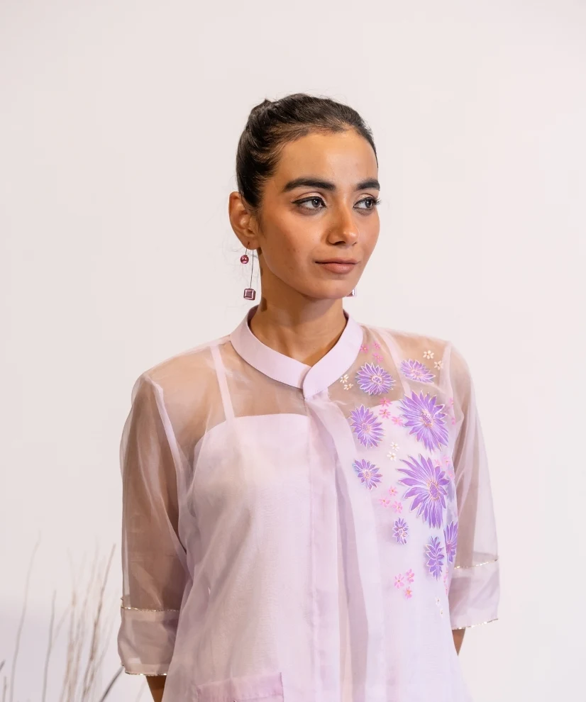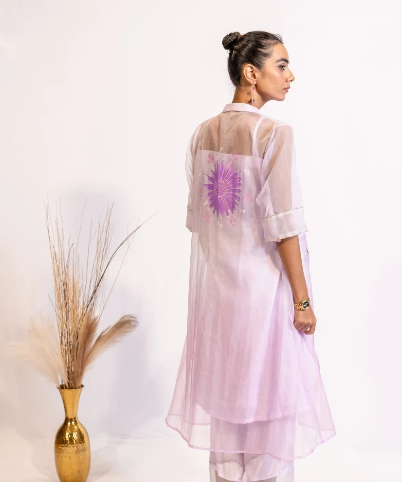 Fabric: Inner Kurta & Pants – Cotton Silk, Shrug – Organza | Handpainting and embellishments on the Organza Shrug | Color: Lavender (Shaded from light to dark) | 3 piece set with Kurta, Pant & Shrug