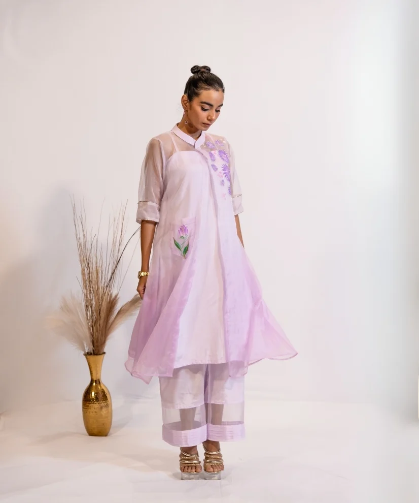 Step into elegance with this lavender ombre kurta set, featuring a soft cotton-silk inner kurta with matching pants. The kurta set comes with an organza shurg – beautifully hand painted with delicate floral motifs on the front panels and back. Soft & graceful this kurta set is a perfect choice for casual brunches & small festive gatherings