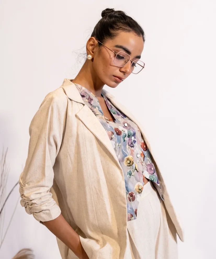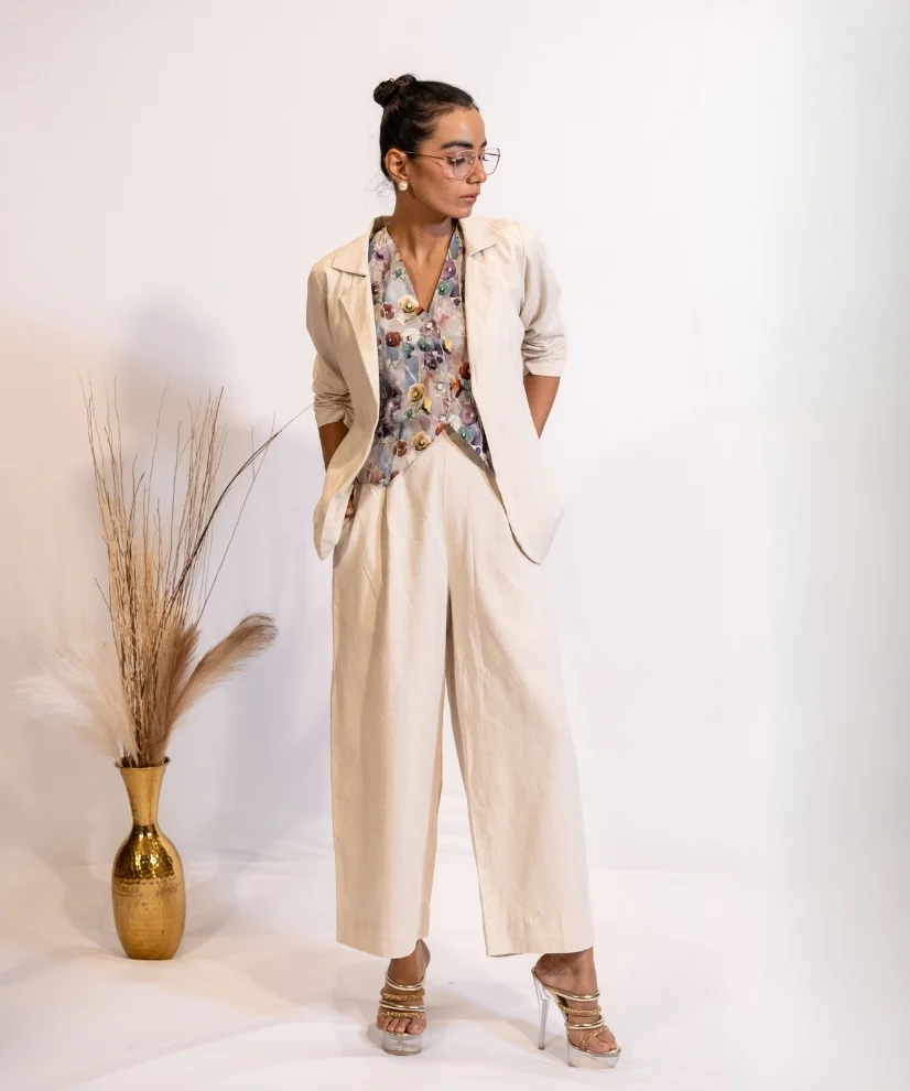 Redefine workwear elegance with this Beige Linen Blazer & Pant Set paired with a vibrant floral cotton vest. Crafted in breathable linen fabric, the blazer & pants set exudes sophistication, while the printed vest coat adds a playful pop of colour. The ensemble is a perfect balance of both comfort & chic.
