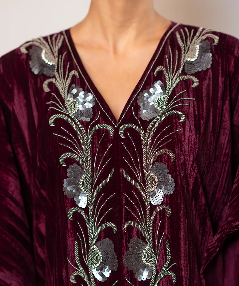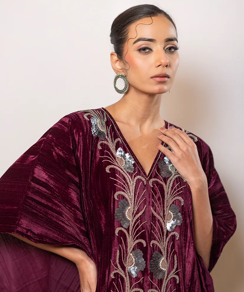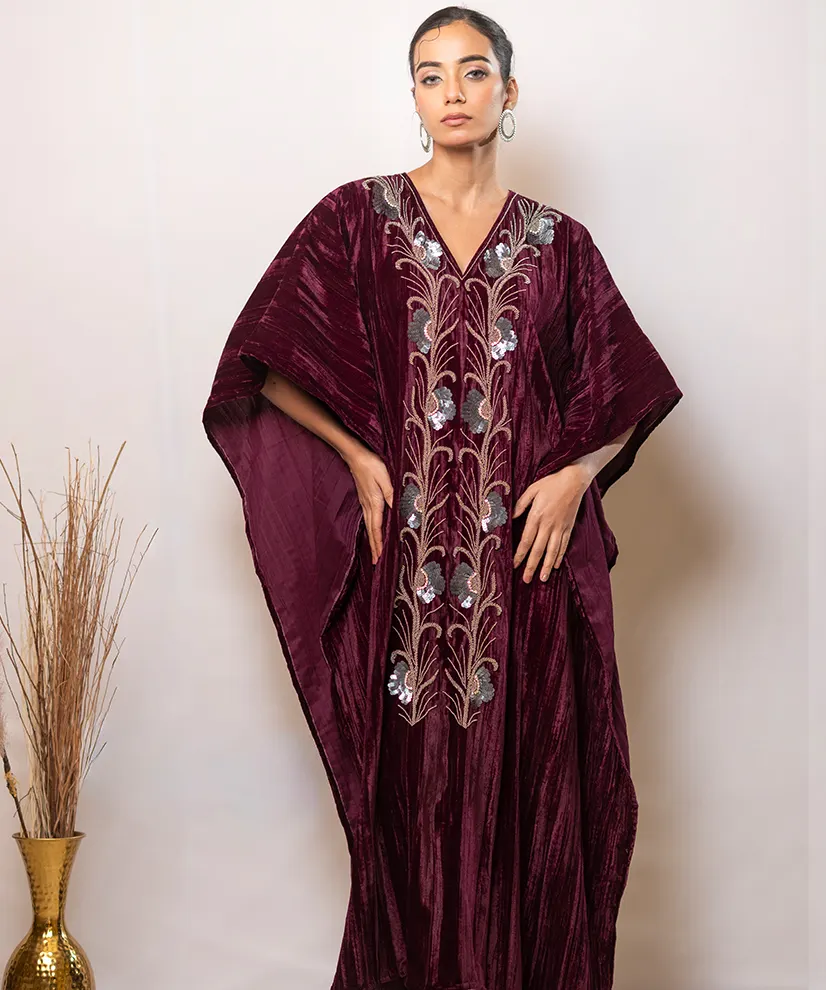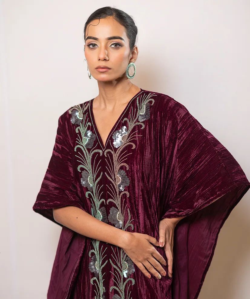 Crafted in plush velvet, this wine-toned kaftan dress is elevated with intricate Aari Zardosi embroidery running along the neckline and centre panel. The rich texture of velvet paired with subtle metallic detailing creates a striking balance of glamour and ease. Designed for fluid movement and effortless elegance, this piece is perfect for evenings that call for understated luxury with a bold presence.
