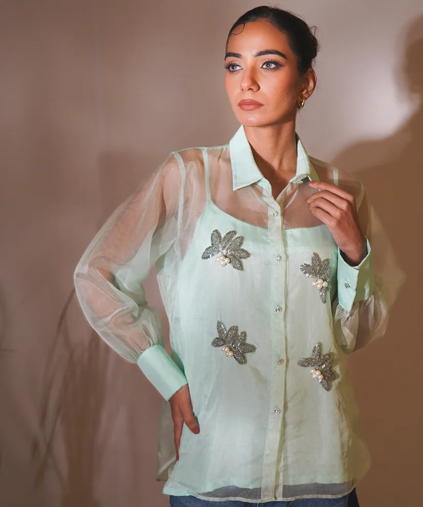 Mint Whisper Hand-Embellished Organza Shirt For Women