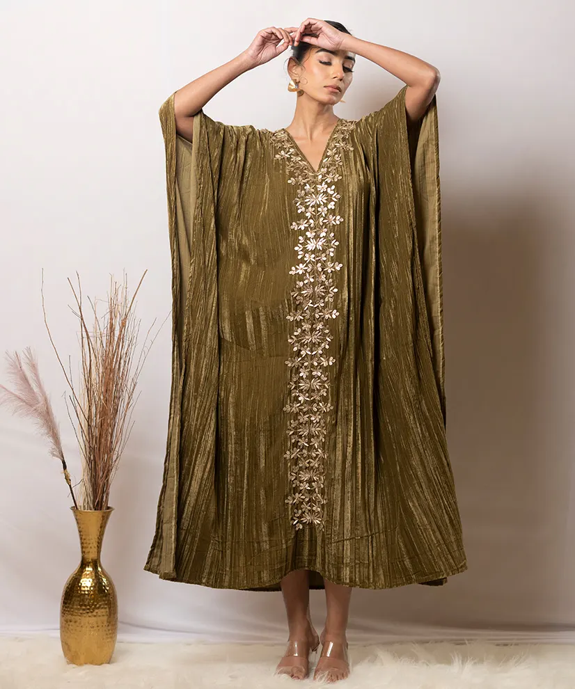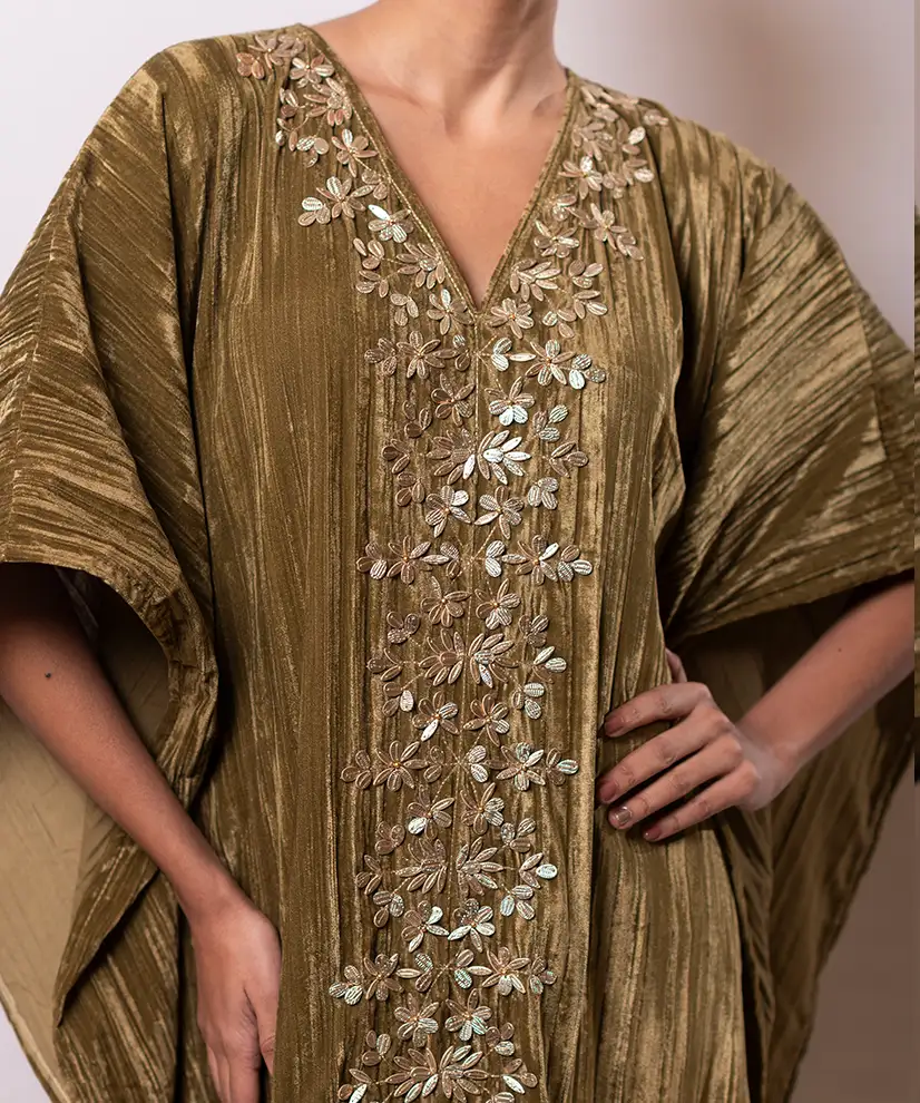Drenched in a rich olive green velvet, this kaftan dress is designed to make a statement through understated glamour. The fluid silhouette is beautifully elevated with hand embellishment running along the neckline and centre, creating a soft shimmer that catches the light with every movement. Luxurious to the touch and easy to wear, this piece blends comfort with refined drama—perfect for evenings that call for effortless elegance.