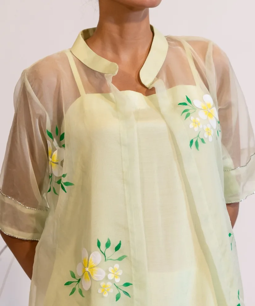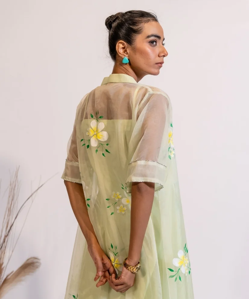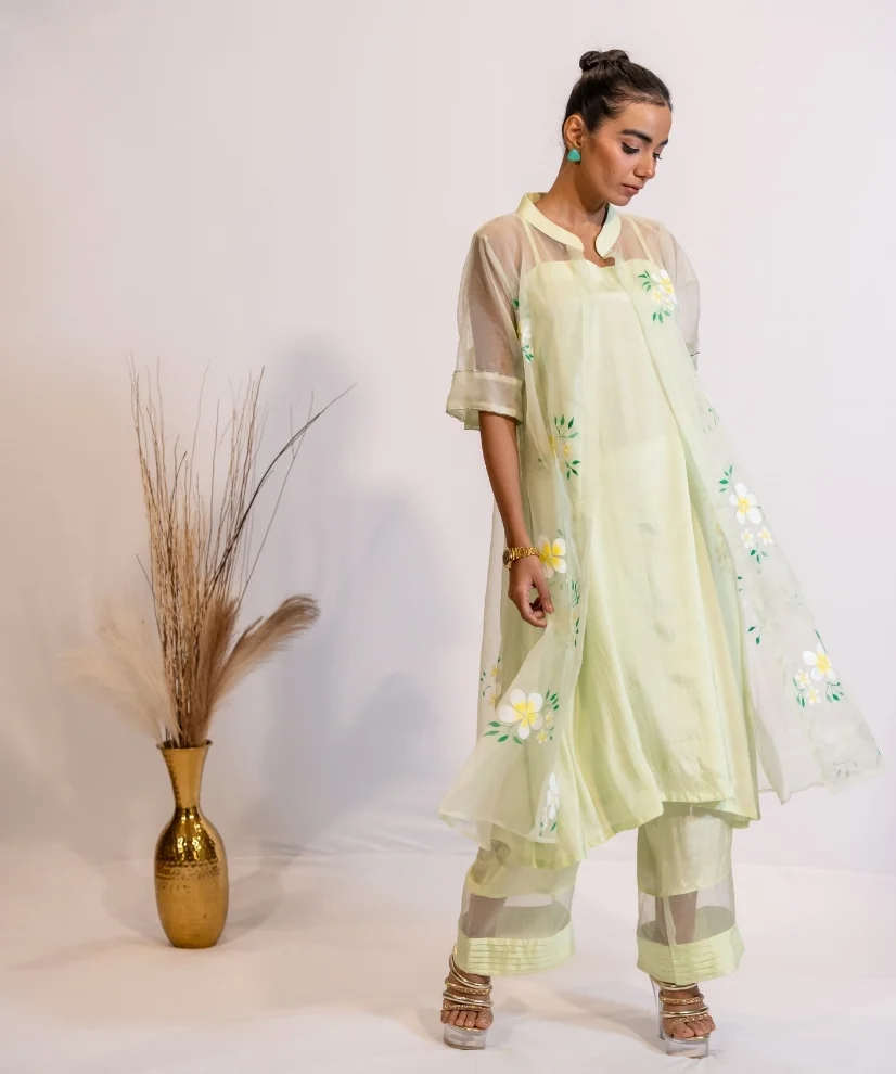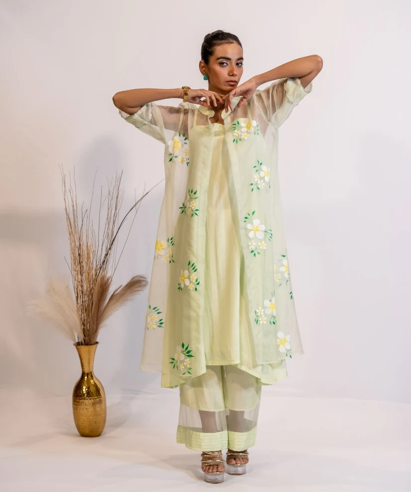 Step into elegance with this pastel pistachio green organza kurta set. Hand-painted daisies bloom all over the organza shrug are highlighted with delicate hand embellishments that bring each motif to life. The soft pastel colour of the outfit adds a refreshing charm, making it a perfect pick for high tea, festive brunches, or intimate gatherings. The set comes with inner kurta & matching pants made from soft light weight cotton silk fabric