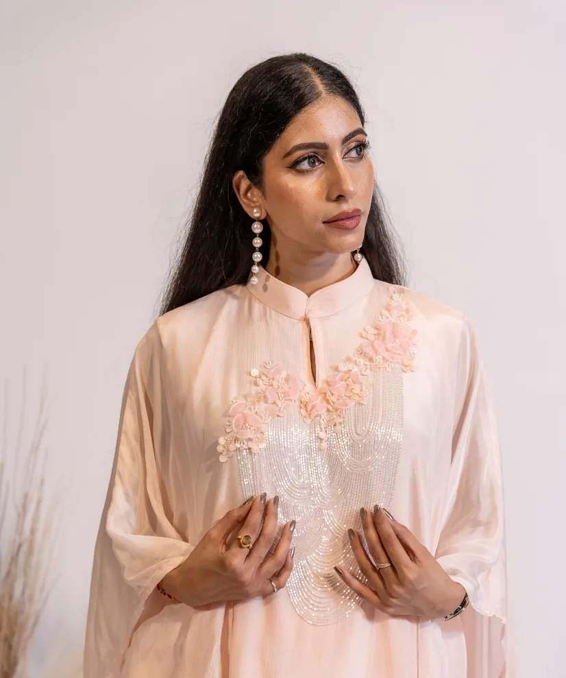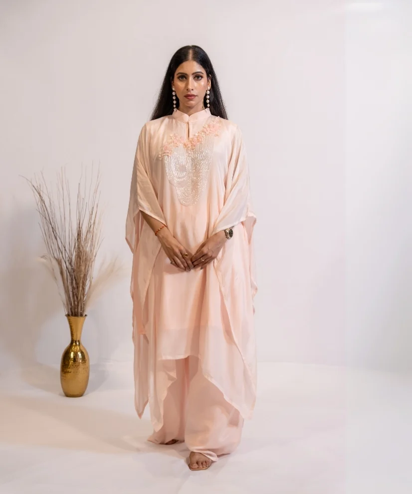 This light peach georgette co-ord set is the perfect mix of elegance and ease. The flowy look of the outfit is elevated by hand embellishments featuring delicate 3D floral patterns and pearl beadwork. Paired with matching pants, the pastel coloured co-ord set carries a soft, graceful charm. Light weight, easy to carry and rich in embroidery, the outfit is designed for women who love timeless sophistication