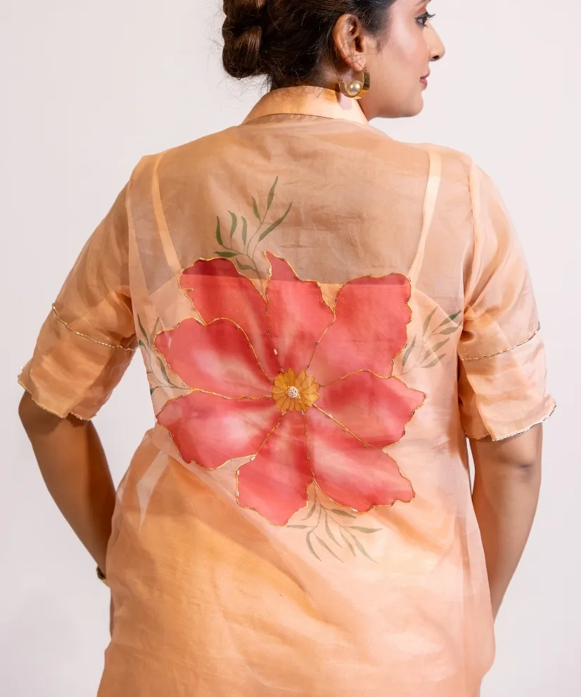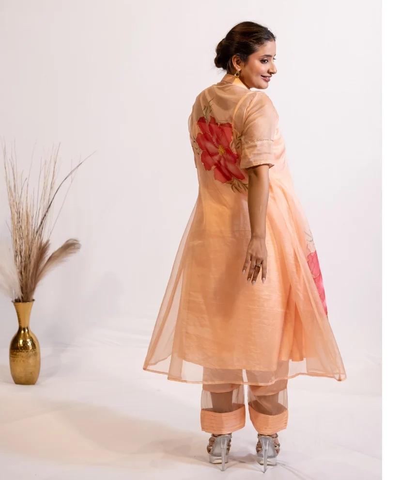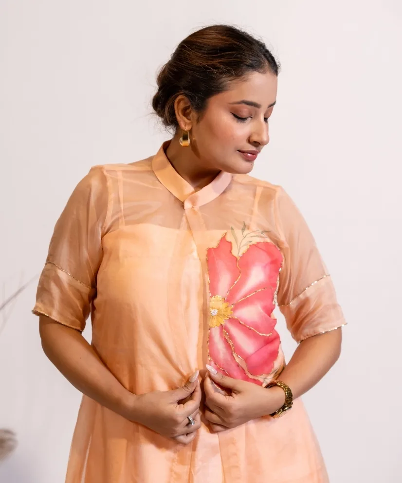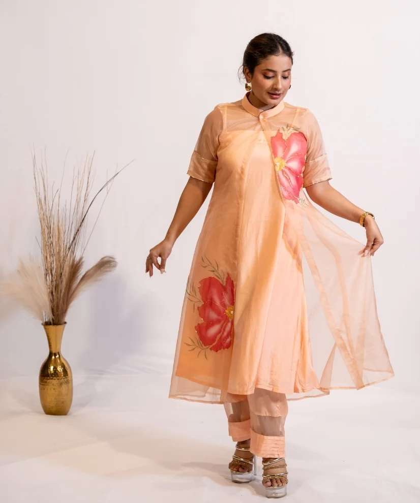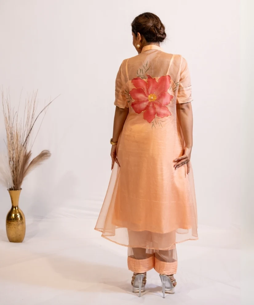 Bring a soft glow to your wardrobe with this peach hand-painted organza kurta set. Made with cotton silk inner kurta and pants, the look is elevated with a sheer organza shrug hand-painted in bold floral motifs on front and back. The pastel peach colour of the outfit flatters every skin tone, while the hand-painting and embellishments add an artistic charm to the ensemble.