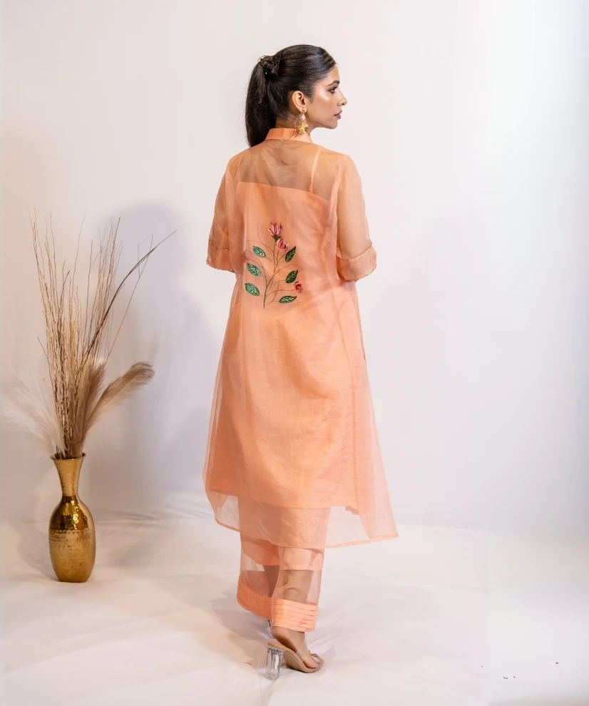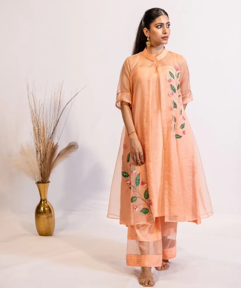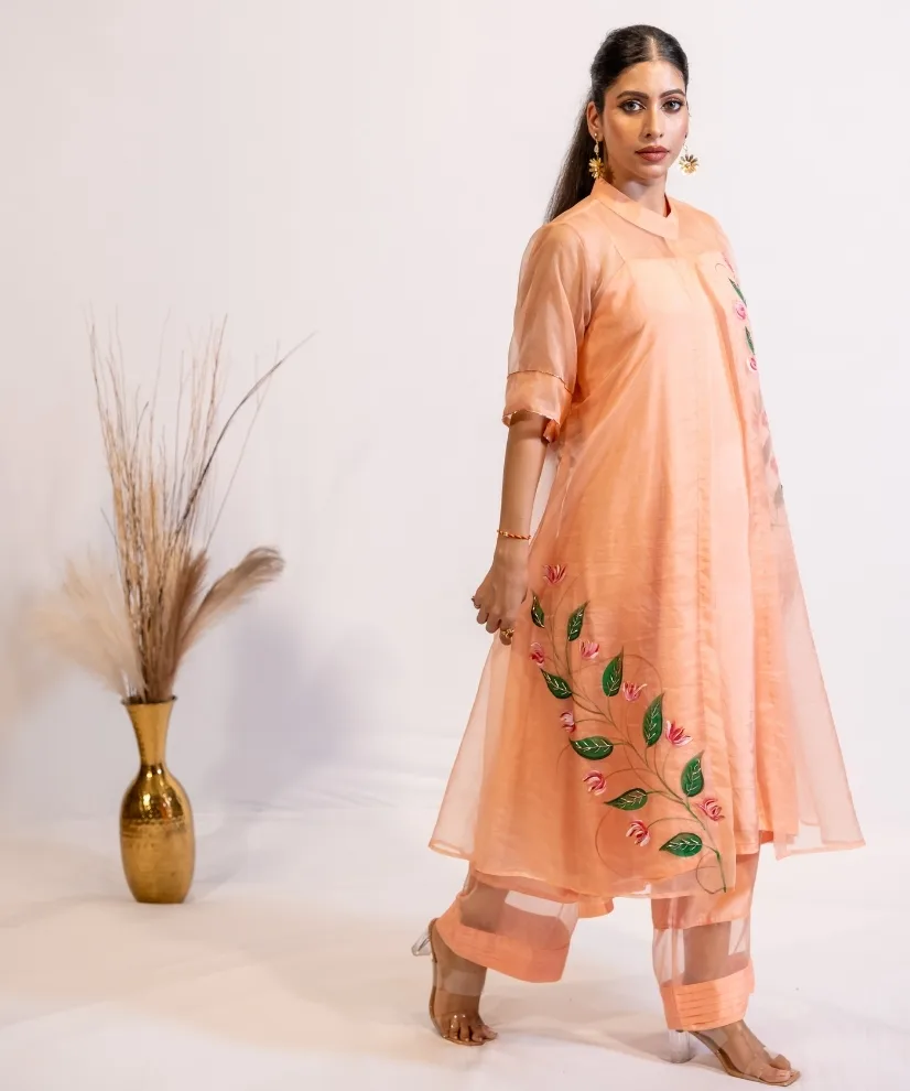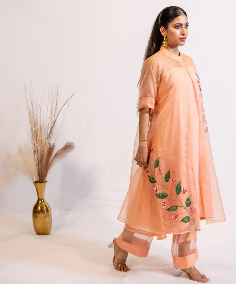 Step into elegance with this peach hand-painted organza kurta set. The organza shrug is delicately adorned with floral and leafy motifs, hand-painted and hand-embellished to perfection. The pastel peach colour adds to the graceful charm of the outfit, the soft cotton silk kurta & pants under the shrug make the outfit a perfect balance between comfort and luxury.