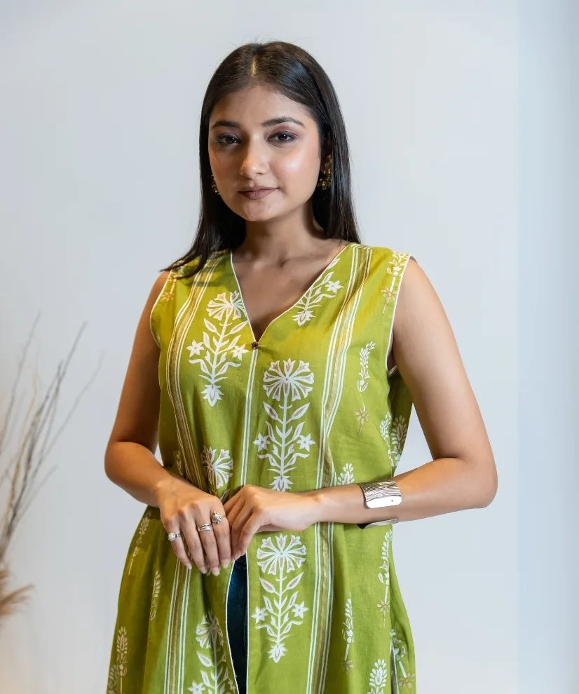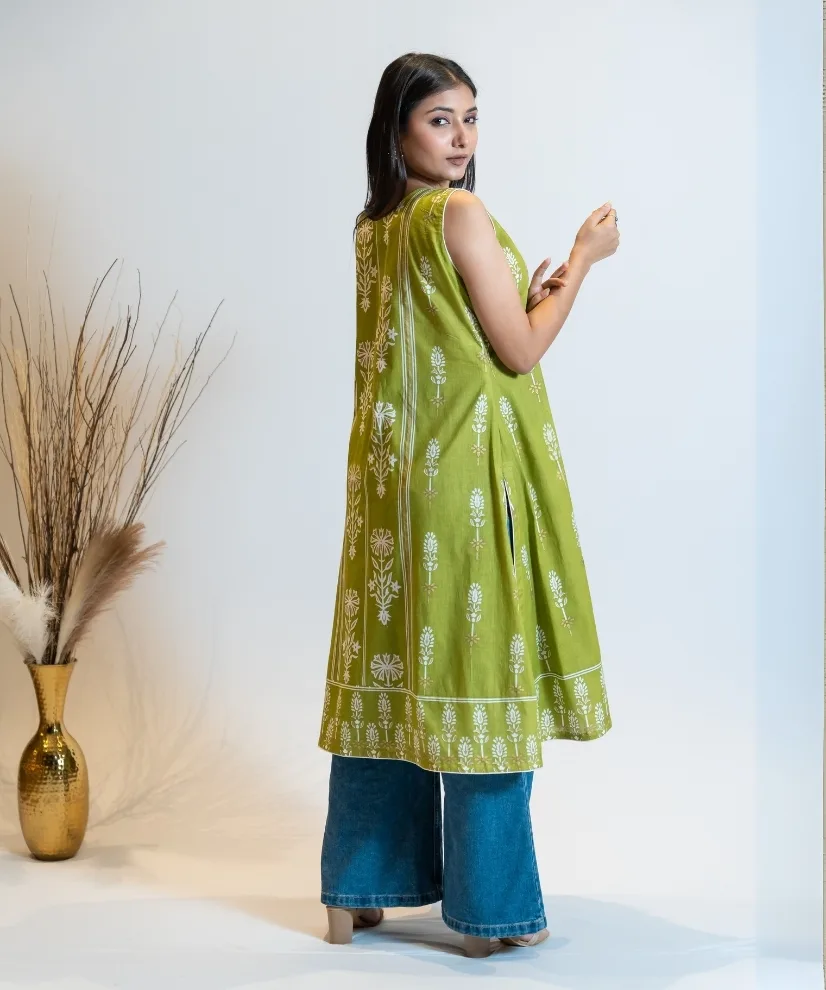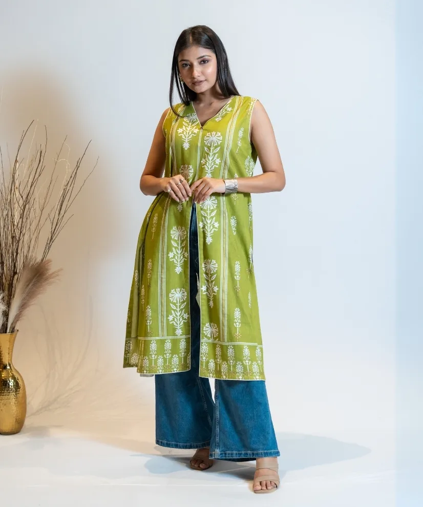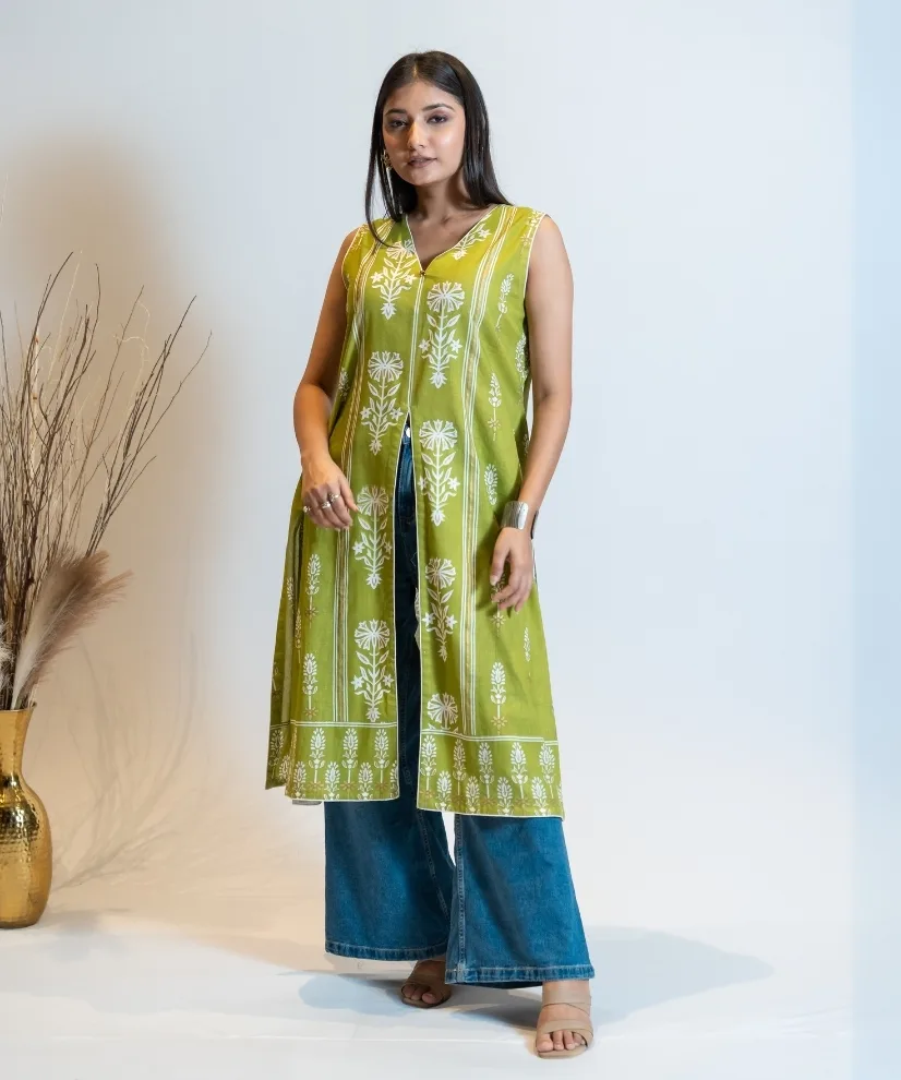 Fresh, fuss-free, and versatile — this pista green cotton-linen kurti features classic white floral prints with a front and side slit design for a playful, modern edge. The sleeveless cut and breathable fabric make it perfect for office days, coffee dates, or quick mall hops with friends..