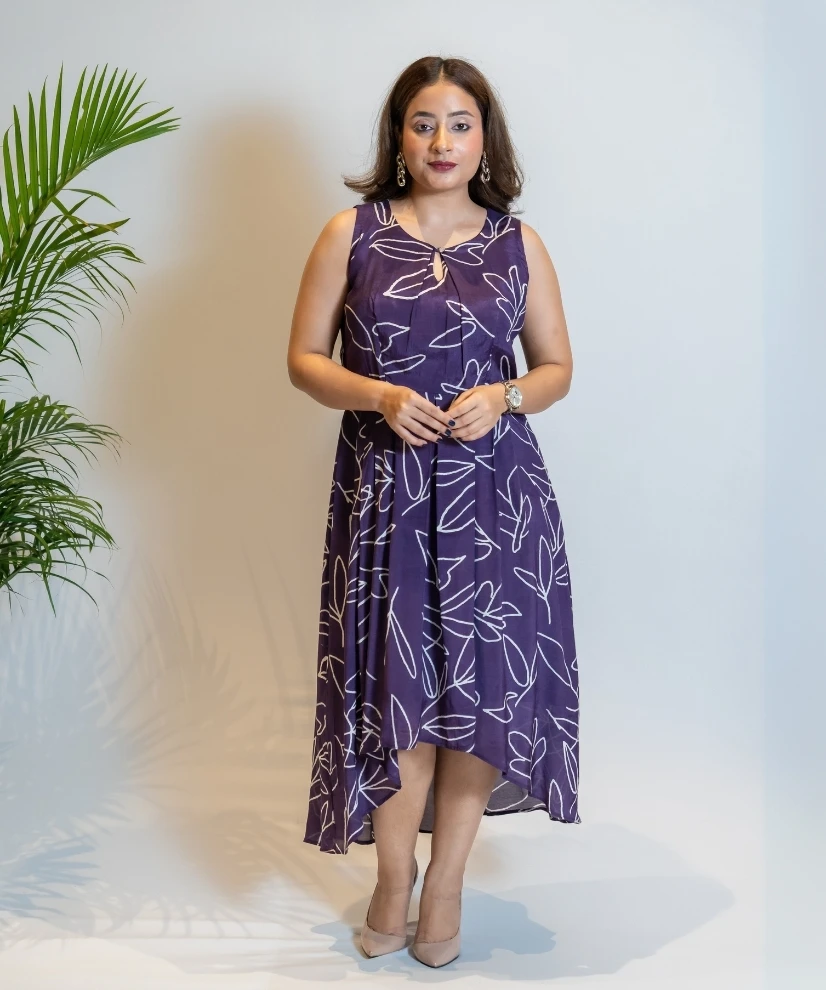 Sweet yet sassy, this plum purple cotton-linen dress is designed with soft pleats at the bust and a high-low hem that adds subtle drama to every step. Lightweight, breezy, and feminine — it’s a perfect pick for brunches, weekend getaways, or days when you want to feel just a little extra without trying too hard.