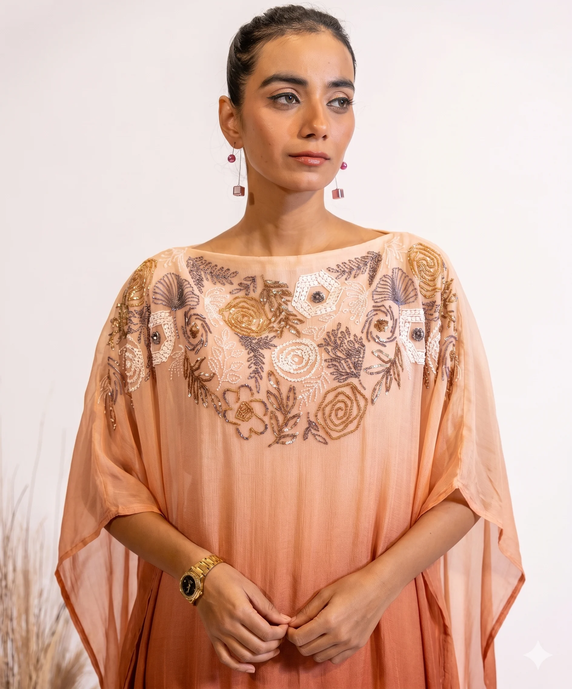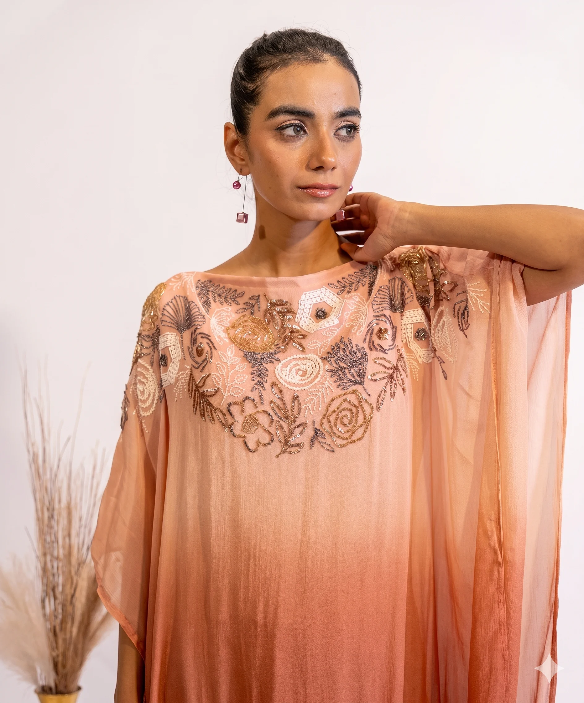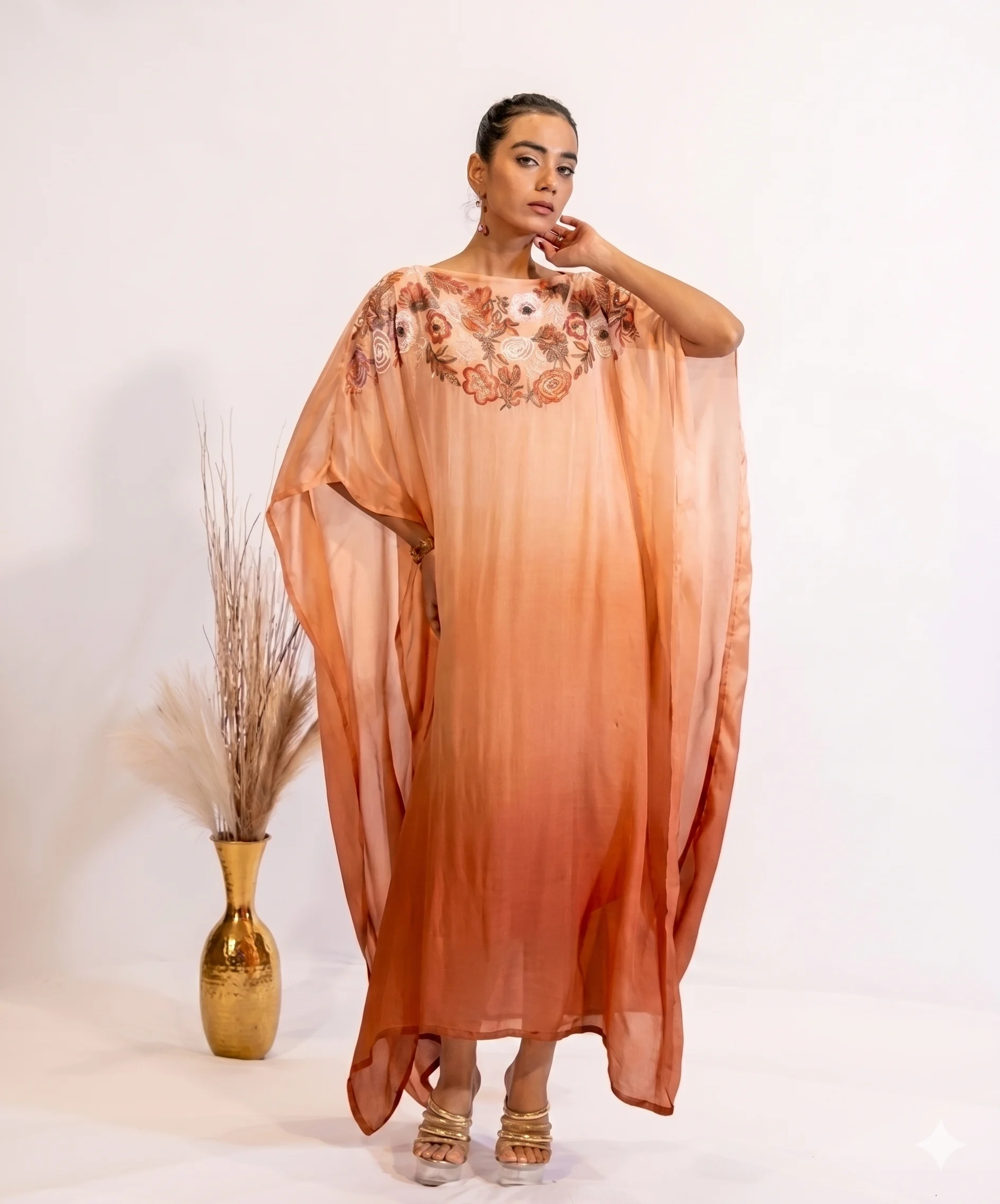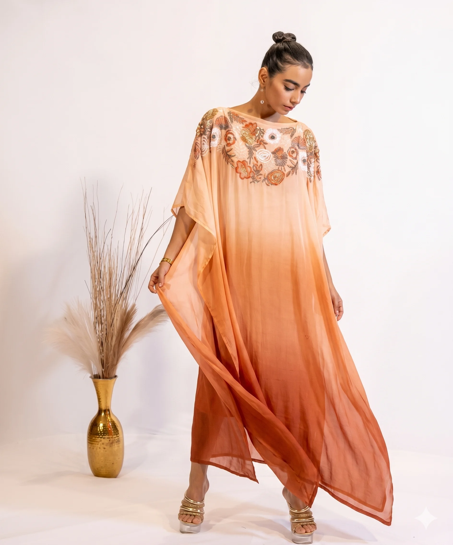 Step into elegance with this Rust Gradient Sequin-Embroidered Sheer Kaftan Dress For Women, a perfect blend of comfort and luxury. The free-flowing silhouette of the Kaftan dress is adorned with intricate hand embellishments – sequins, beads and delicate threadwork, creating a truly one of it’s kind masterpiece. Crafted from premium georgette fabric, this one-piece kaftan dress is an ideal choice for festive evenings, cocktail dinners, or destination celebrations.