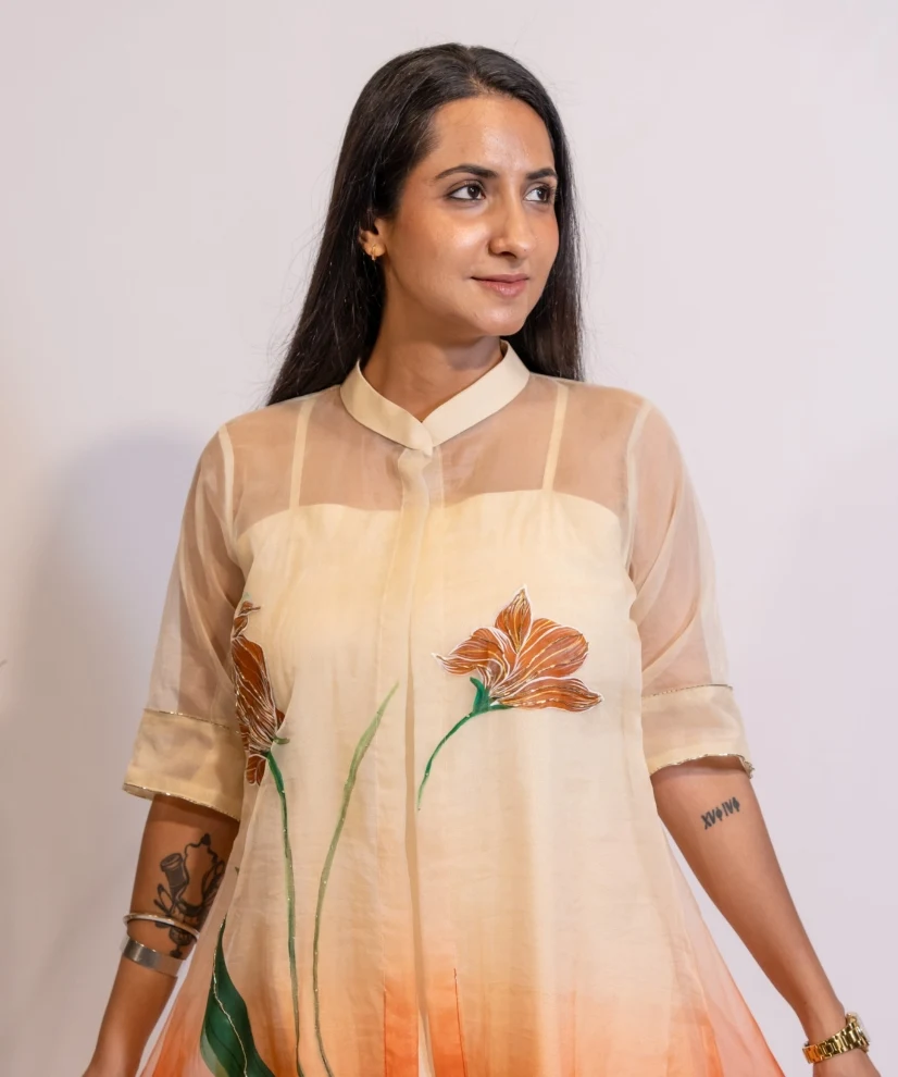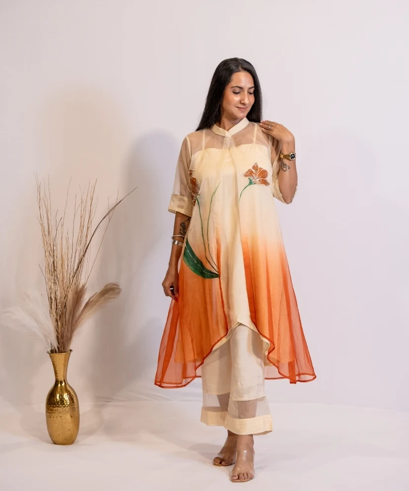 Bask in warm, earthy elegance with this cream-to-rust ombre organza kurta set. Hand-painted and delicately hand-embellished with leafy floral motifs, the organza shrug is a work of art & timeless elegance. It comes with a matching inner kurta and pant set made from soft cotton silk fabric, making the outfit a perfect pick for brunches, festive celebrations or intimate friends and family gatherings.