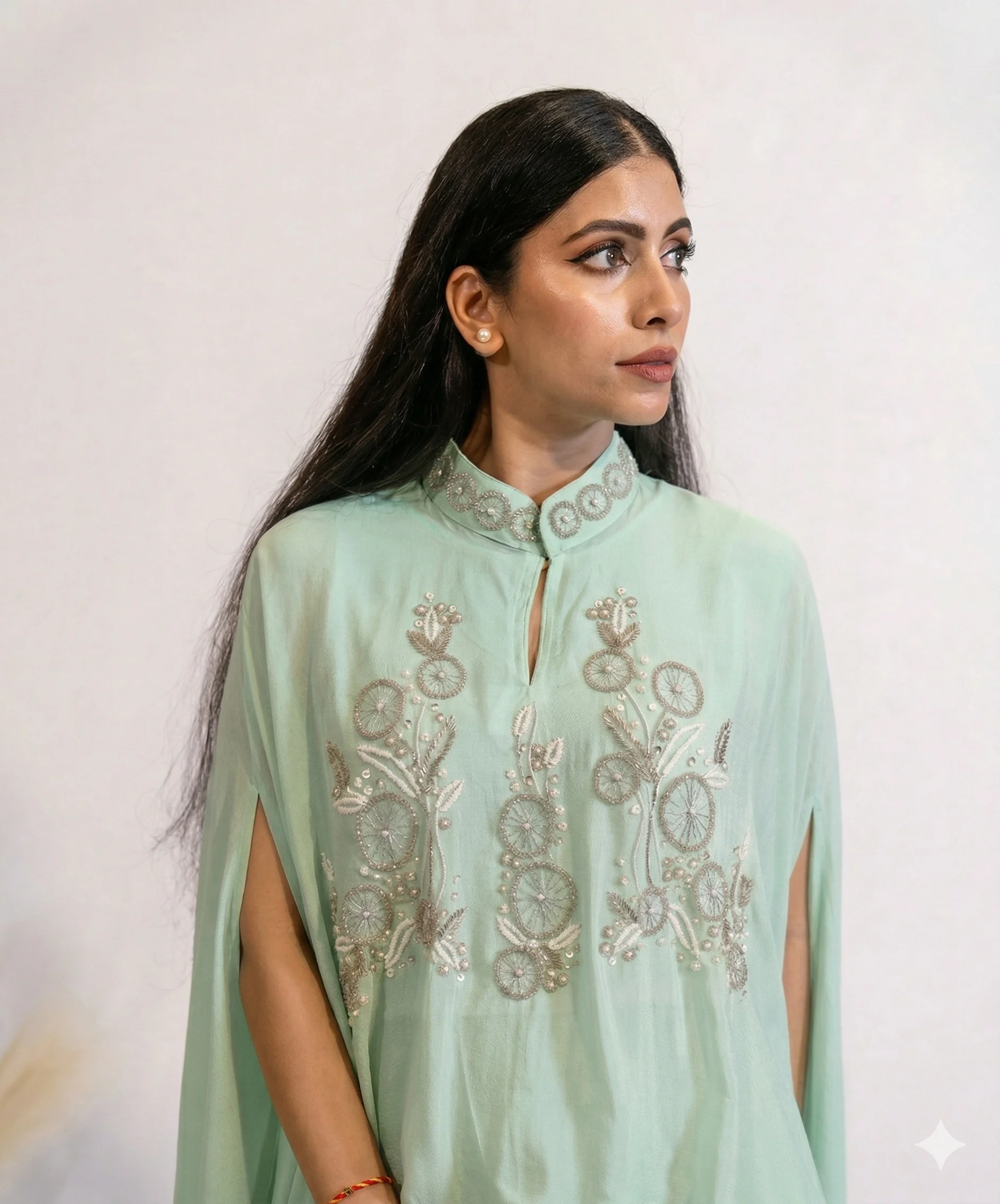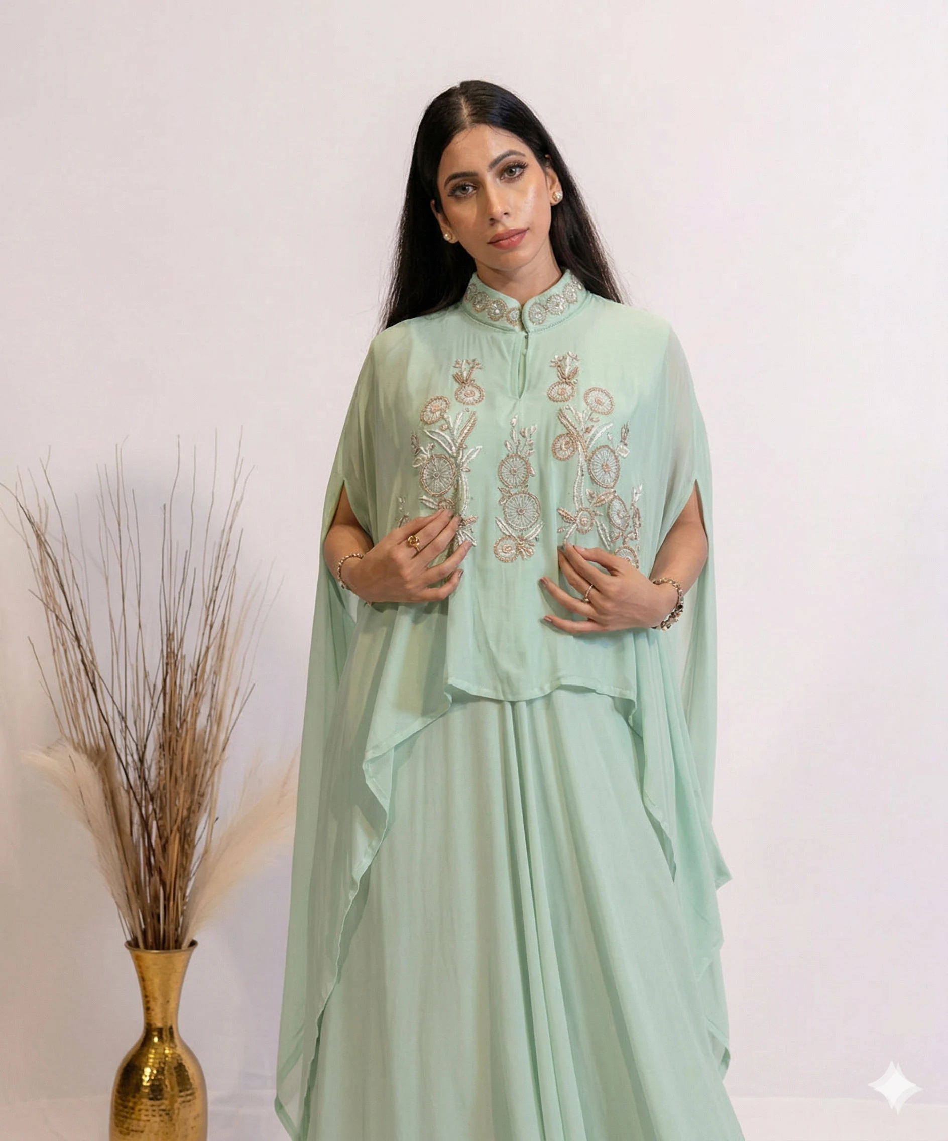 Effortlessly elegant, this Seraphina Mint Hand-Embellished 3-Piece Co-Ord Set For Women is a vision of refined glamour. The co-ord set is made from soft georgette fabric and feels like butter against the skin. The subtle shimmer of the champagne colour and rich embroidery detailing on the top, make the outfit a perfect blend of sophistication and grace. Designed for women who appreciate timeless fashion with a modern edge, this ensemble is ideal for cocktail evenings, festive gatherings, or celebrations where you want to stand out.